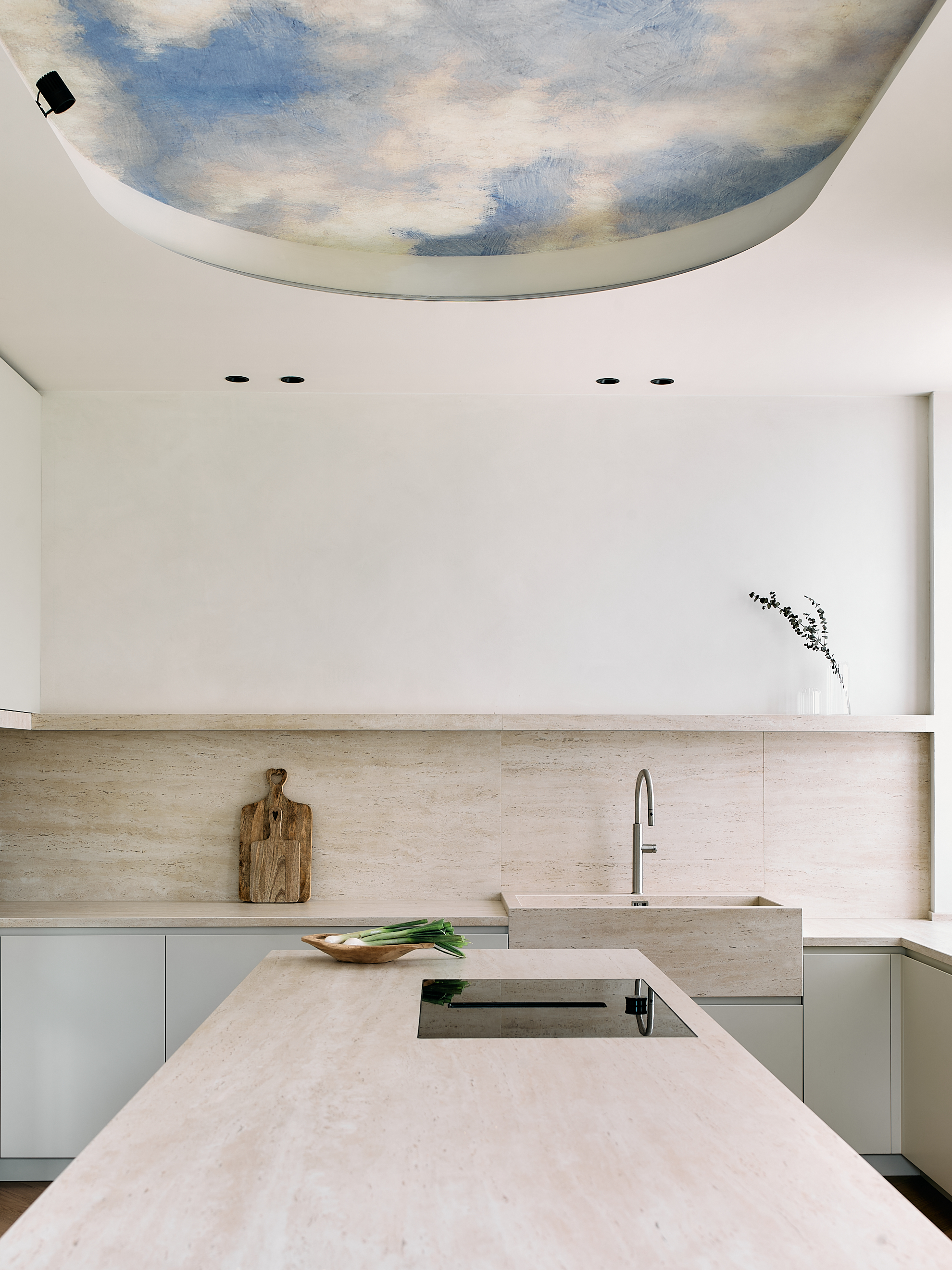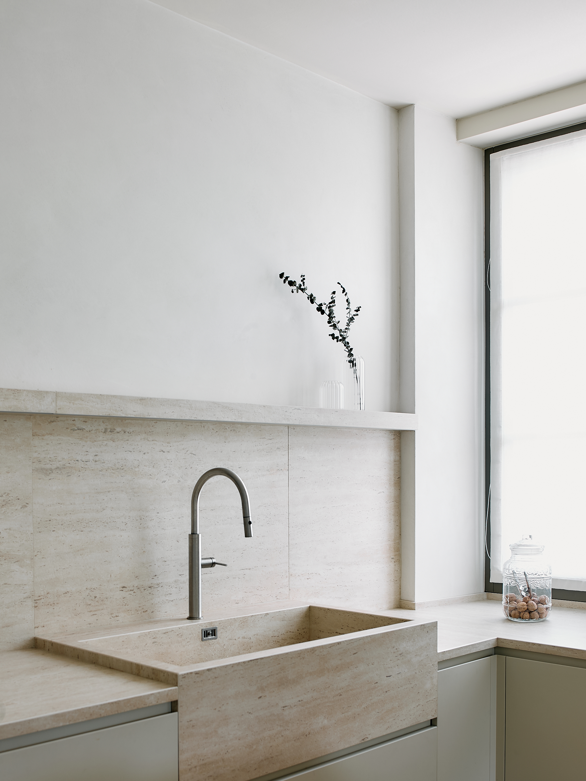 La cucina si presenta come un volume monolitico, puro e scultoreo.