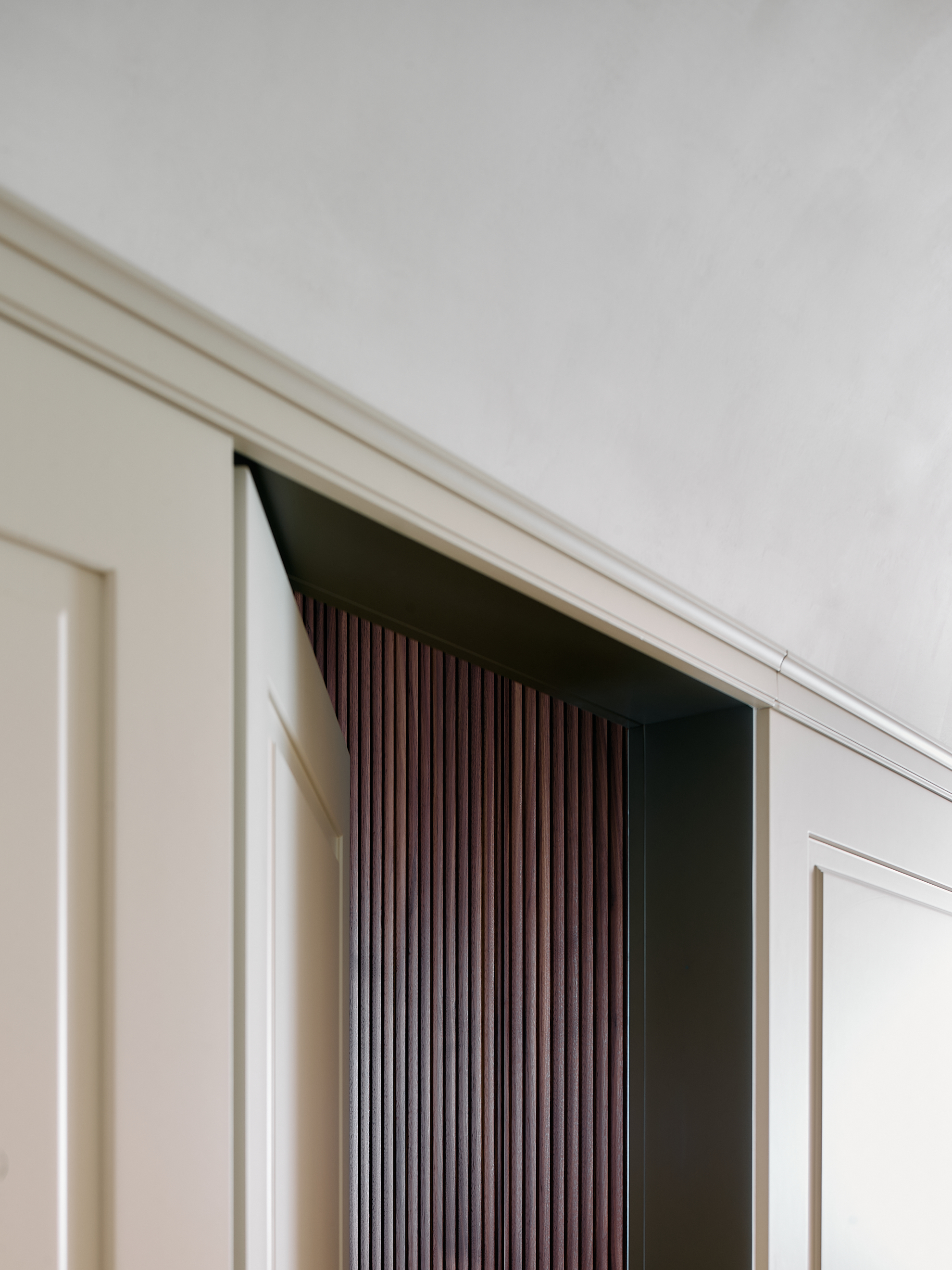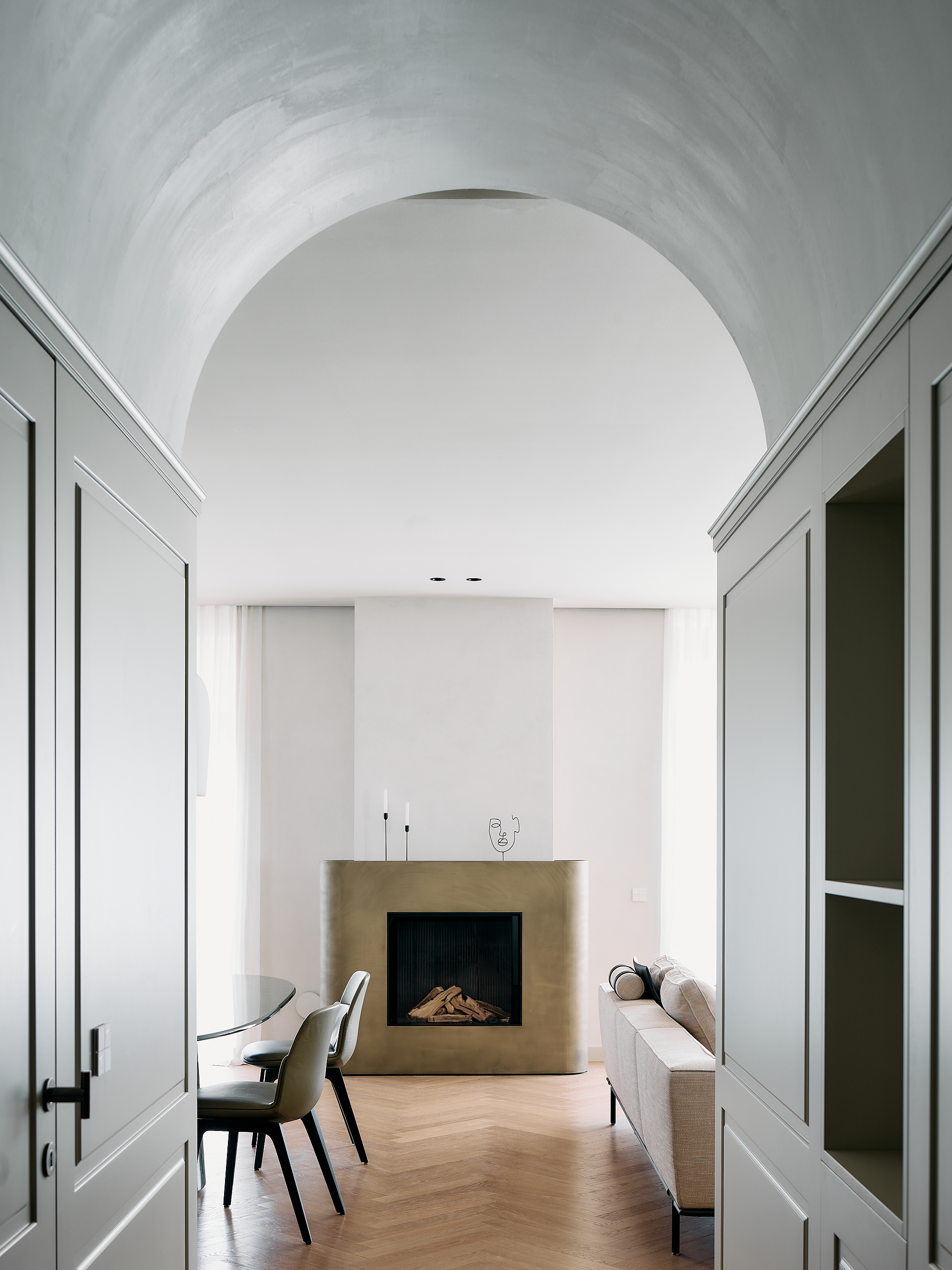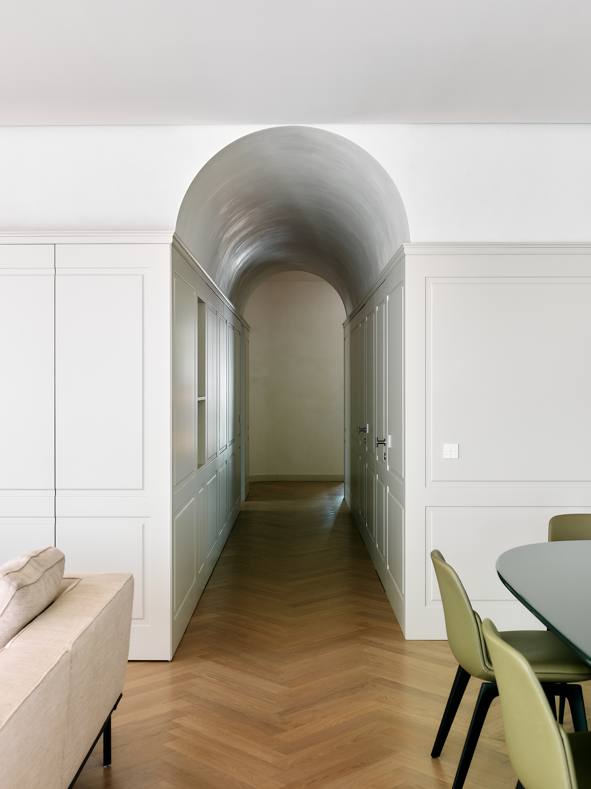 Nella zona giorno i corridoi a volta, le boiserie in legno laccato disegnano uno spazio avvolgente e ordinato. I pannelli, sagomati e fresati, poi finiti uno a uno dai nostri falegnami, accompagnano il perimetro della stanza integrando porte e armadiature in un unico gesto architettonico. La laccatura opaca, in una tonalità neutra e calda, dialoga con la luce e con il pavimento in rovere posato a spina, restituendo un senso di calma e continuità.