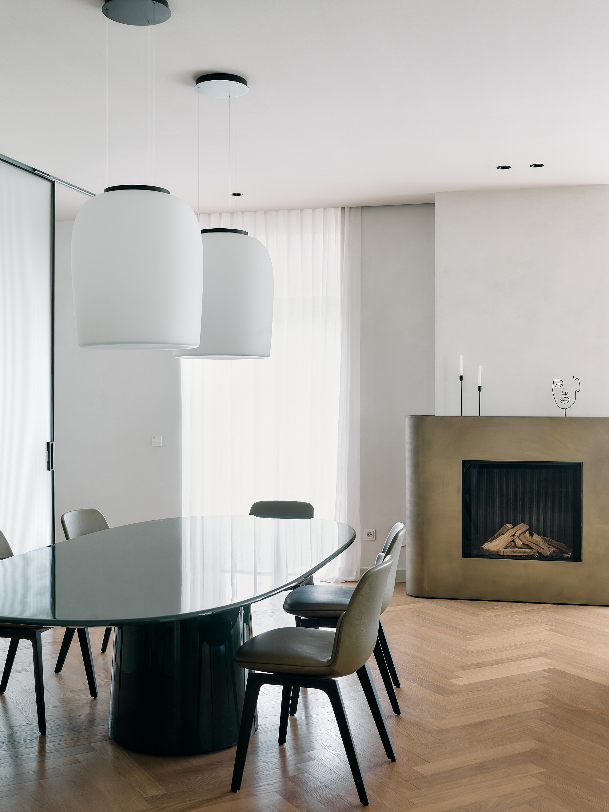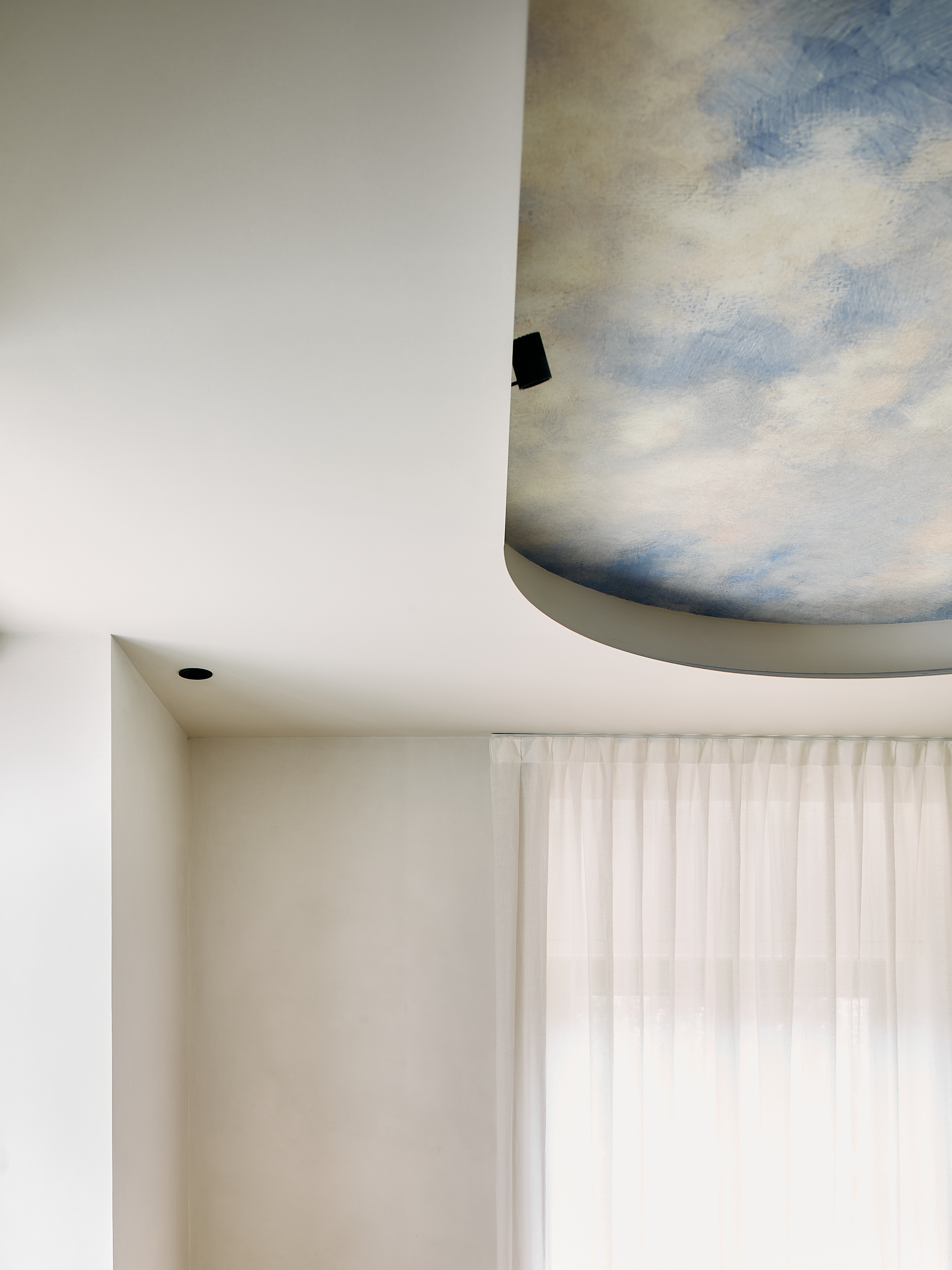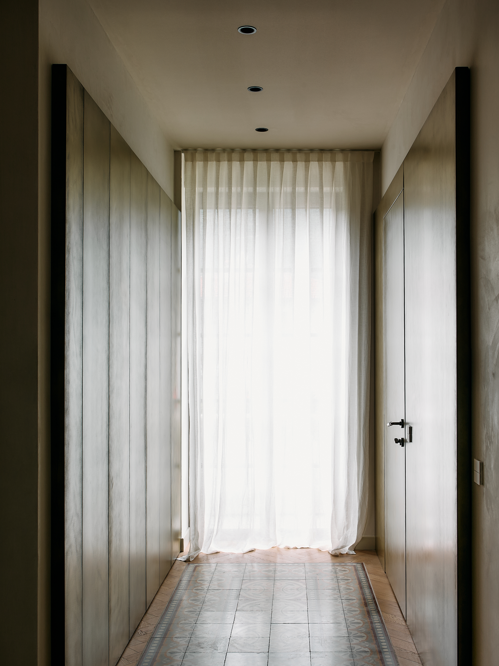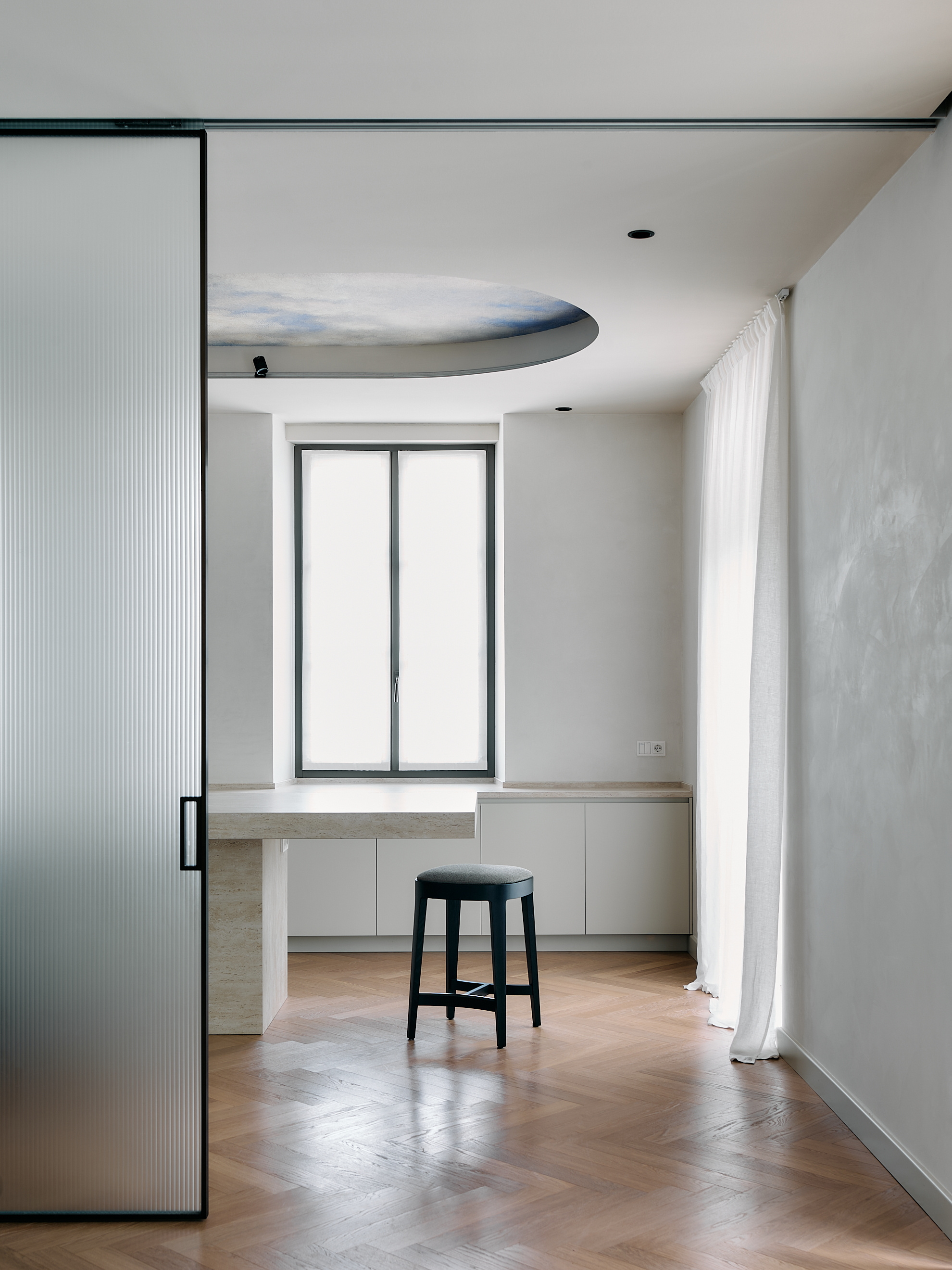 Nella zona giorno i corridoi a volta, le boiserie in legno laccato disegnano uno spazio avvolgente e ordinato. I pannelli, sagomati e fresati, poi finiti uno a uno dai nostri falegnami, accompagnano il perimetro della stanza integrando porte e armadiature in un unico gesto architettonico. La laccatura opaca, in una tonalità neutra e calda, dialoga con la luce e con il pavimento in rovere posato a spina, restituendo un senso di calma e continuità.