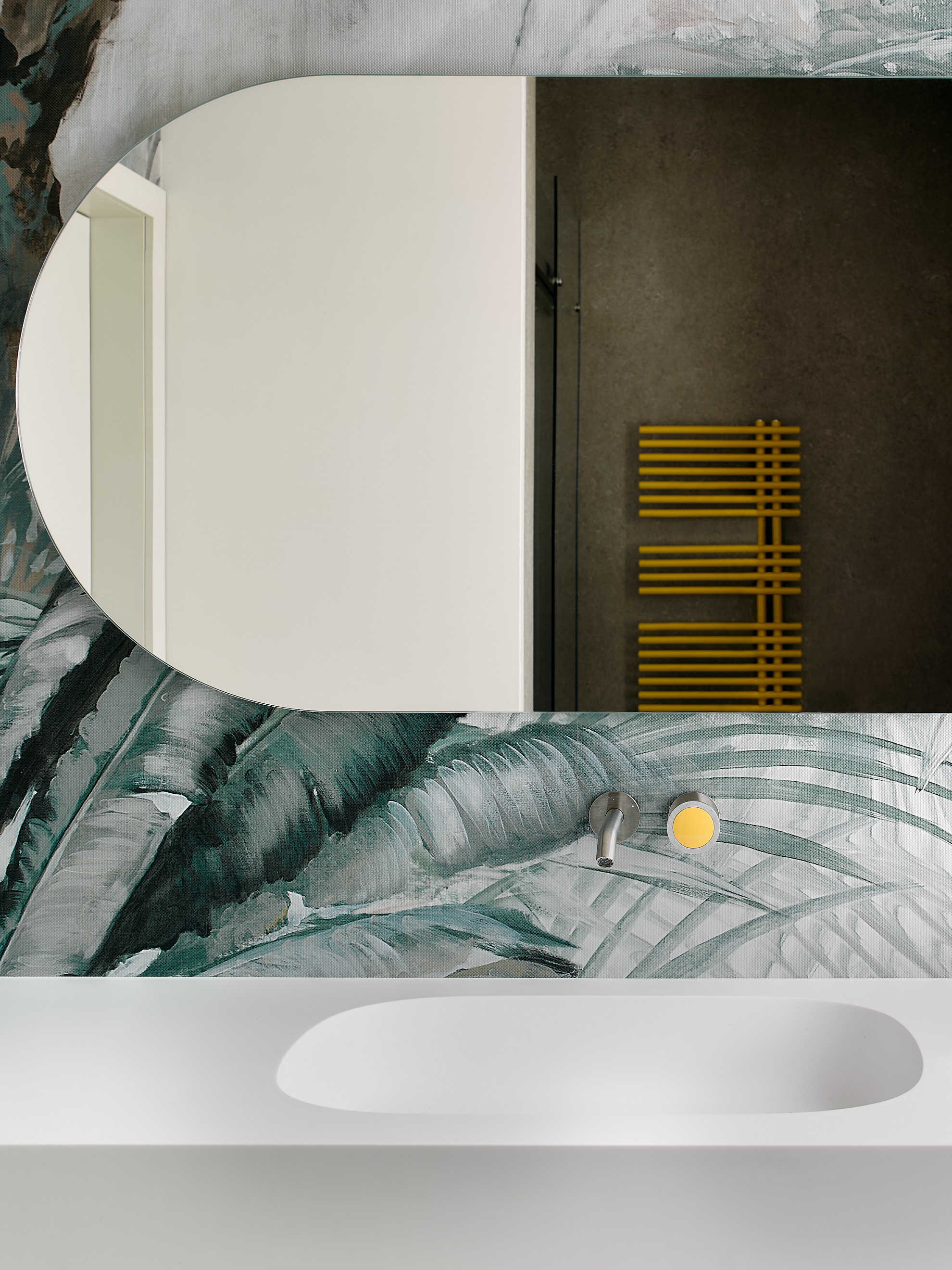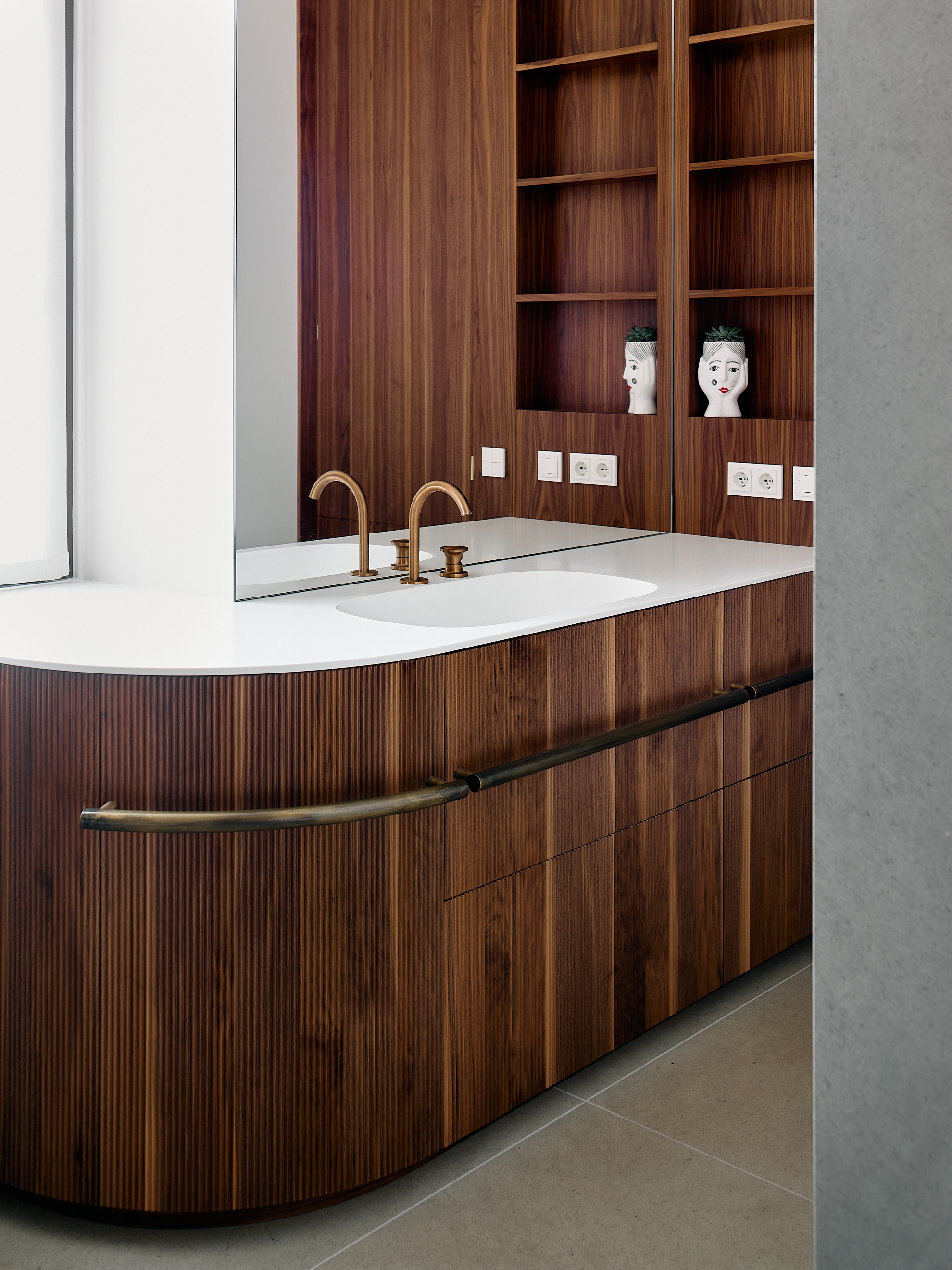 La stessa finitura è ripresa nel mobile del bagno, dove la linearità del noce incontra gli accessori in ottone brunito, introducendo un contrasto elegante tra matericità e riflessi metallici.
