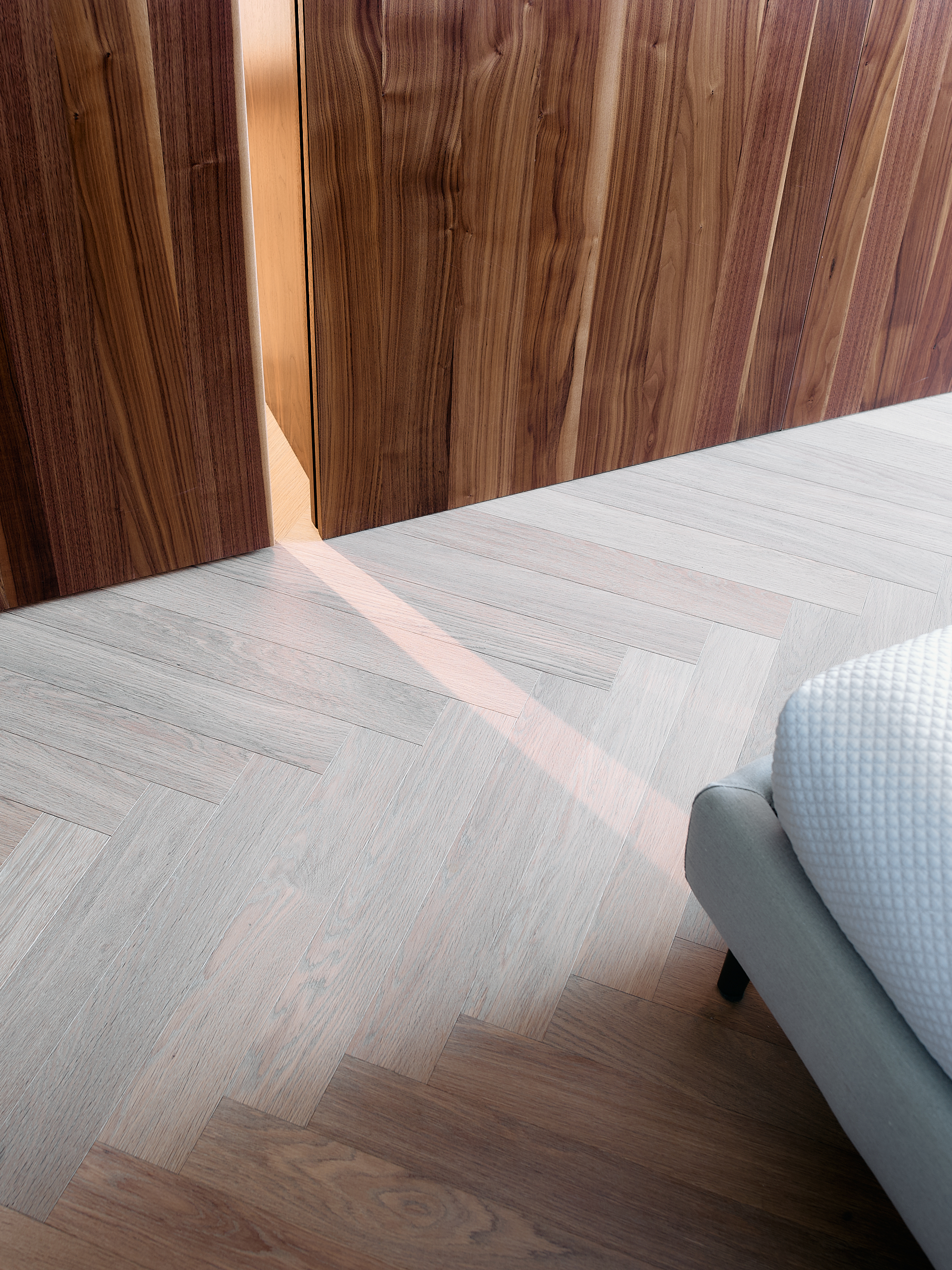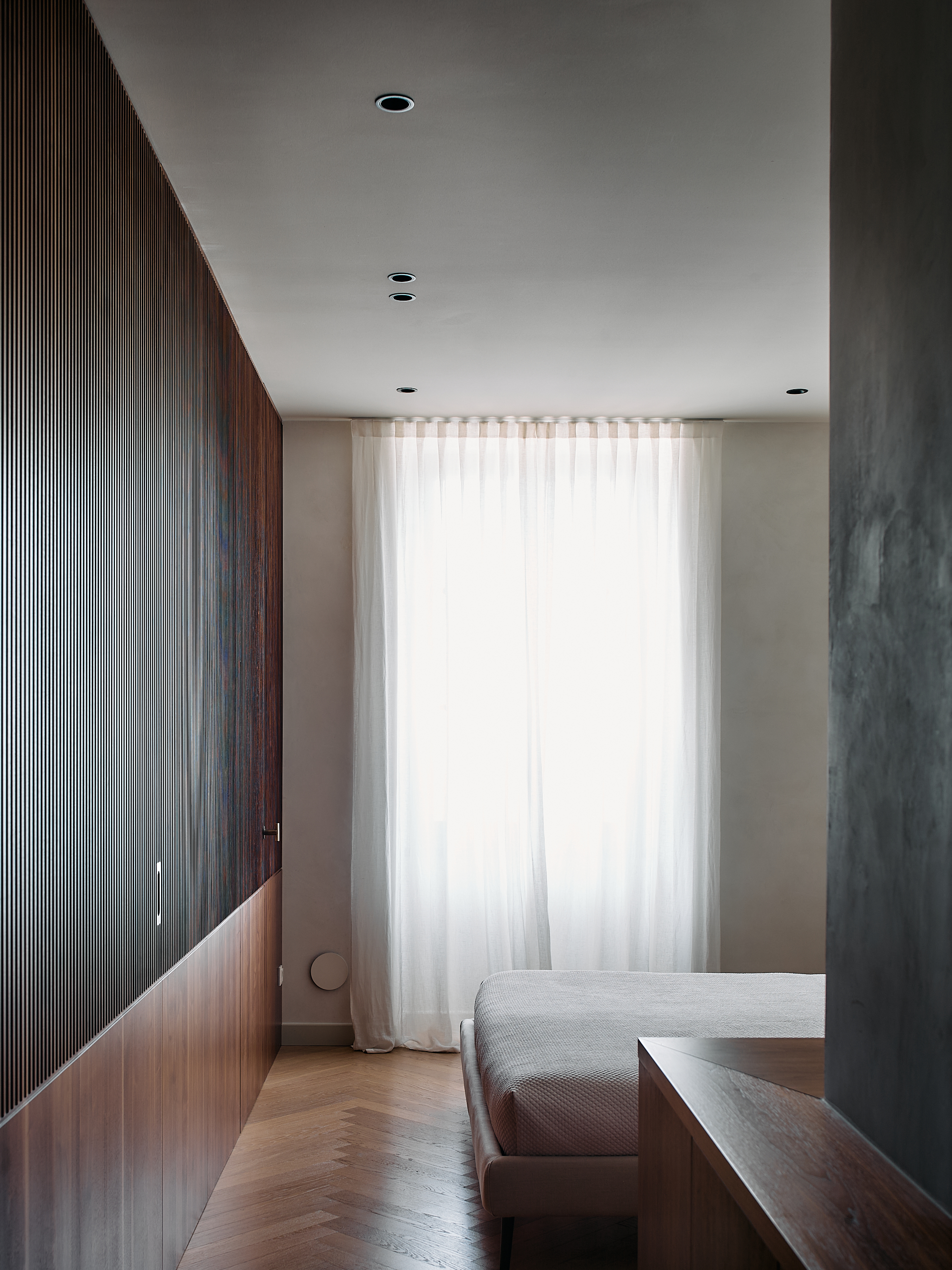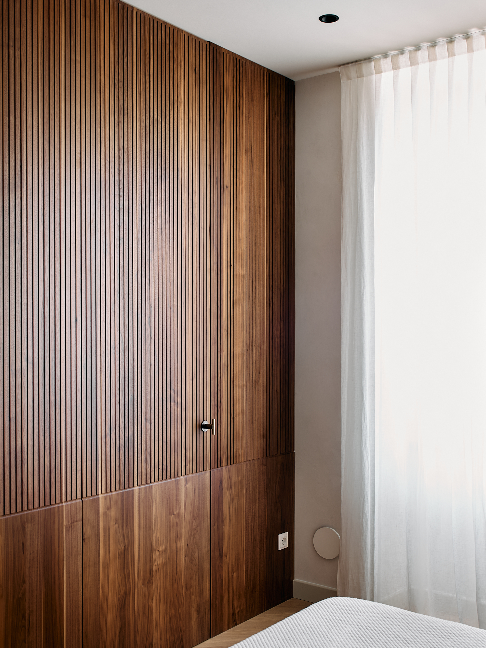 Nella camera padronale, la parete divisoria e contenitiva in noce canaletto, diventa il vero elemento architettonico del progetto. Realizzata su misura dai nostri falegnami, separa il bagno con un gesto di grande precisione e pulizia formale. La superficie è scandita da fresature verticali ripassate una ad una a mano, calibrate per creare ritmo, profondità e una texture tattile che esalta la naturale venatura del legno.