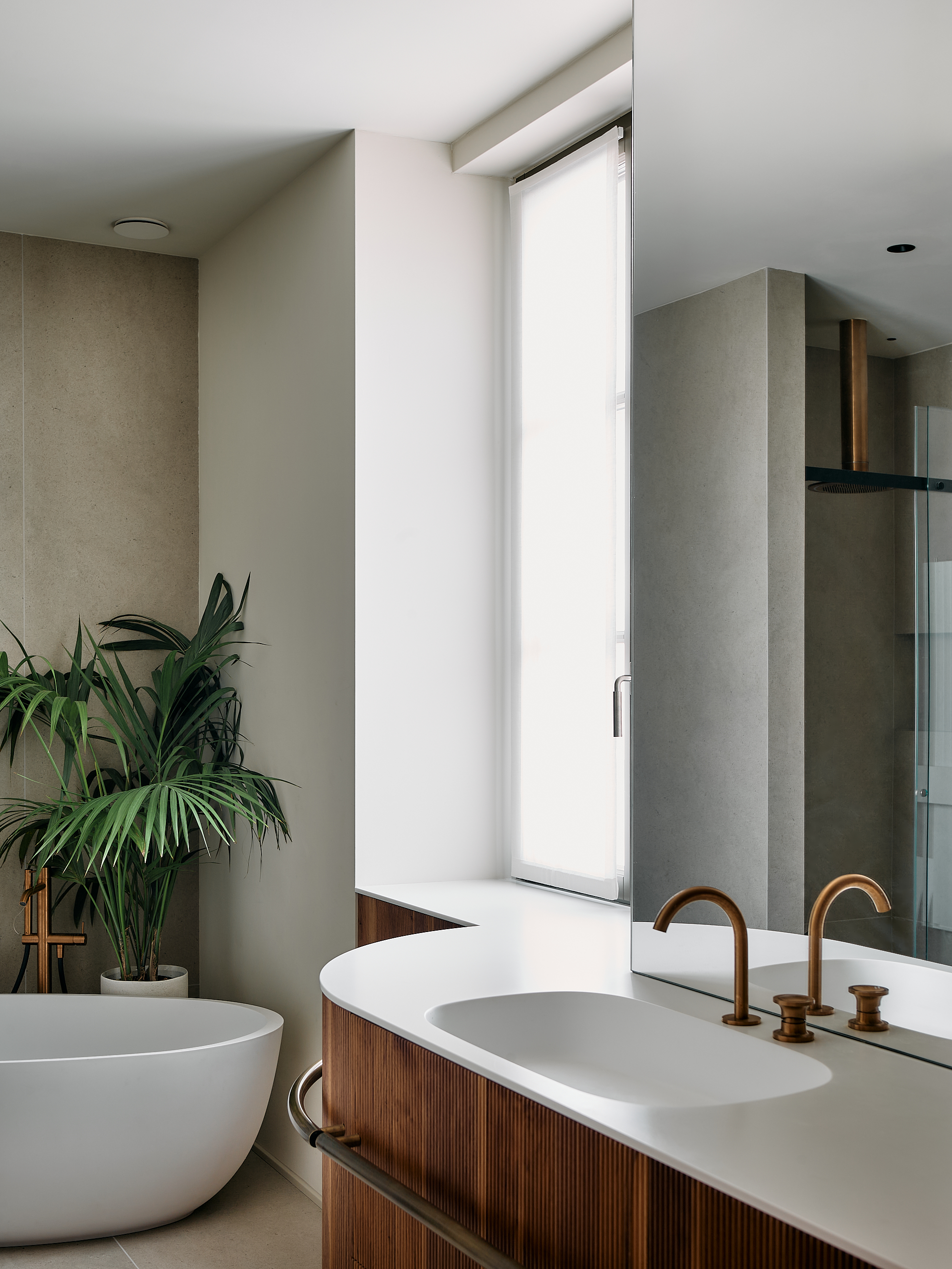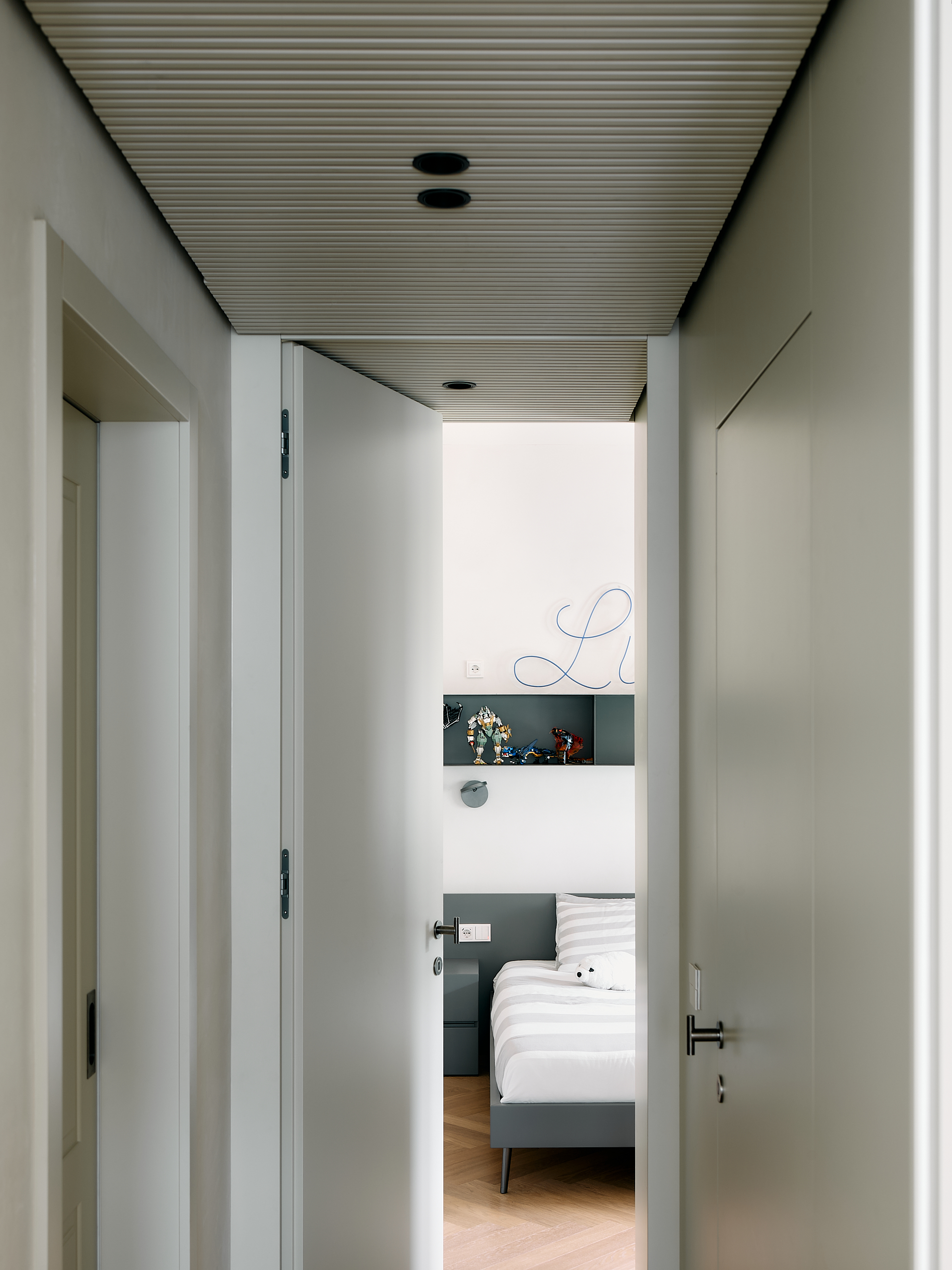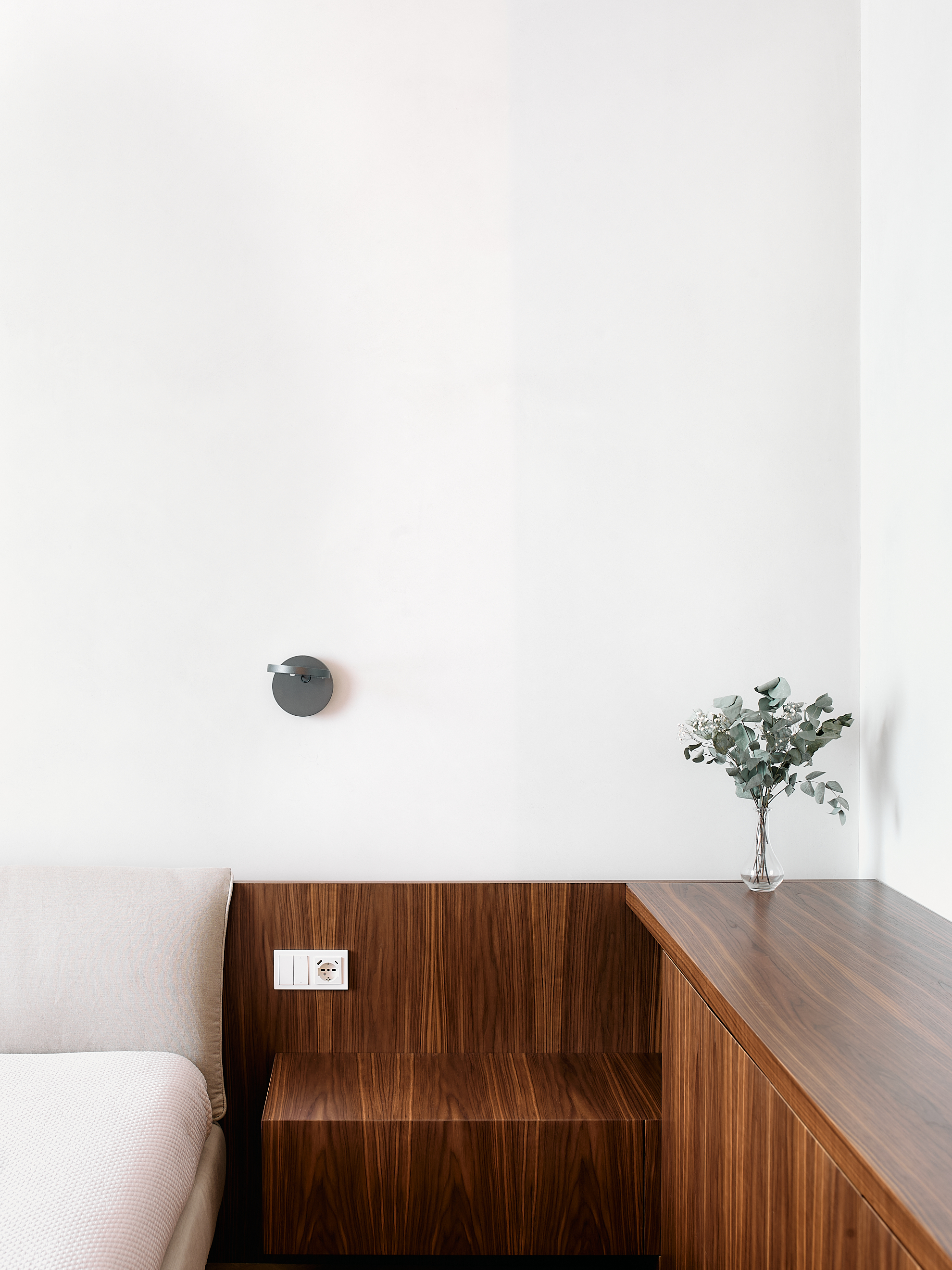 Nella camera padronale, la parete divisoria e contenitiva in noce canaletto, diventa il vero elemento architettonico del progetto. Realizzata su misura dai nostri falegnami, separa il bagno con un gesto di grande precisione e pulizia formale. La superficie è scandita da fresature verticali ripassate una ad una a mano, calibrate per creare ritmo, profondità e una texture tattile che esalta la naturale venatura del legno.