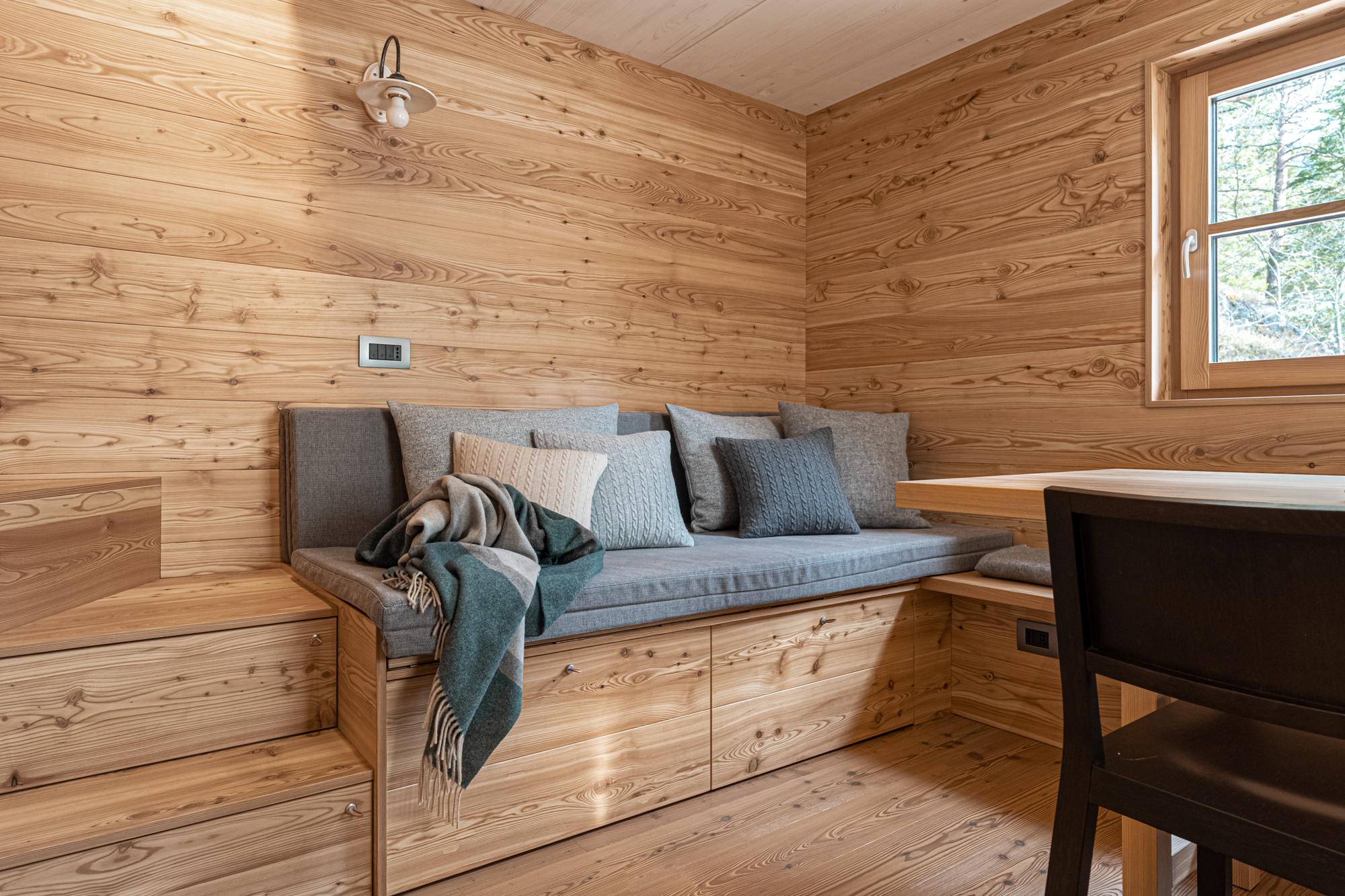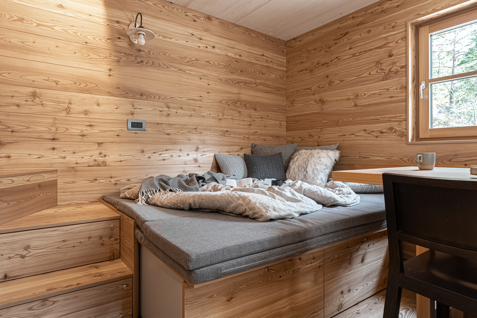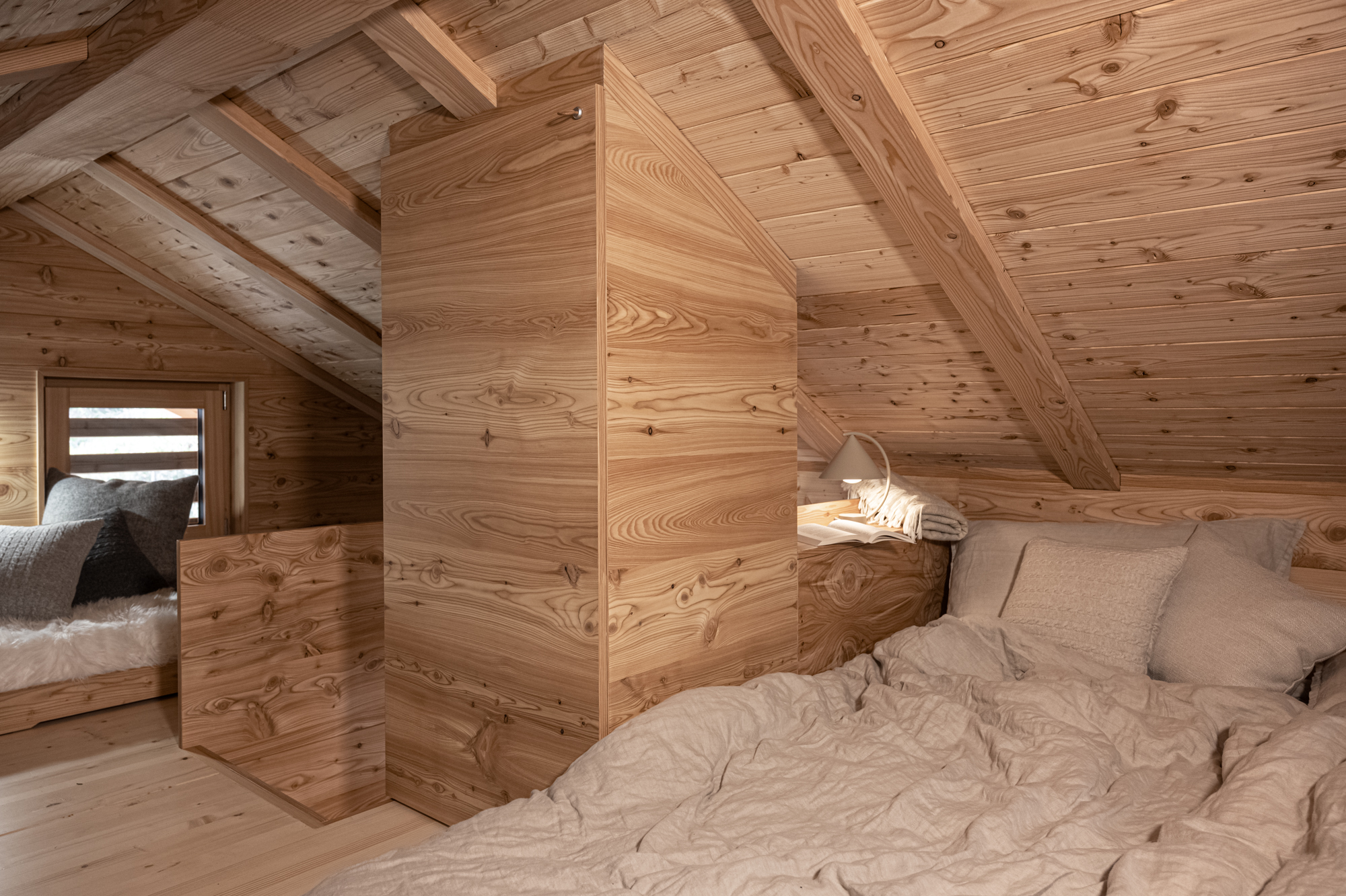 Partendo da una pianta di 4,5×3,7 m e dal desiderio del committente di creare uno spazio di convivialità per famiglia ed amici, si è sviluppato il progetto di uno chalet di montagna, dove il legno di larice ne è il protagonista. Grazie alla realizzazione su misura, è stato possibile sfruttare ogni centimetro di spazio disponibile, risolvendo la richiesta del committente di ricavare fino a 7 posti letto in 17 mq senza rinunciare alla funzionalità d’uso.