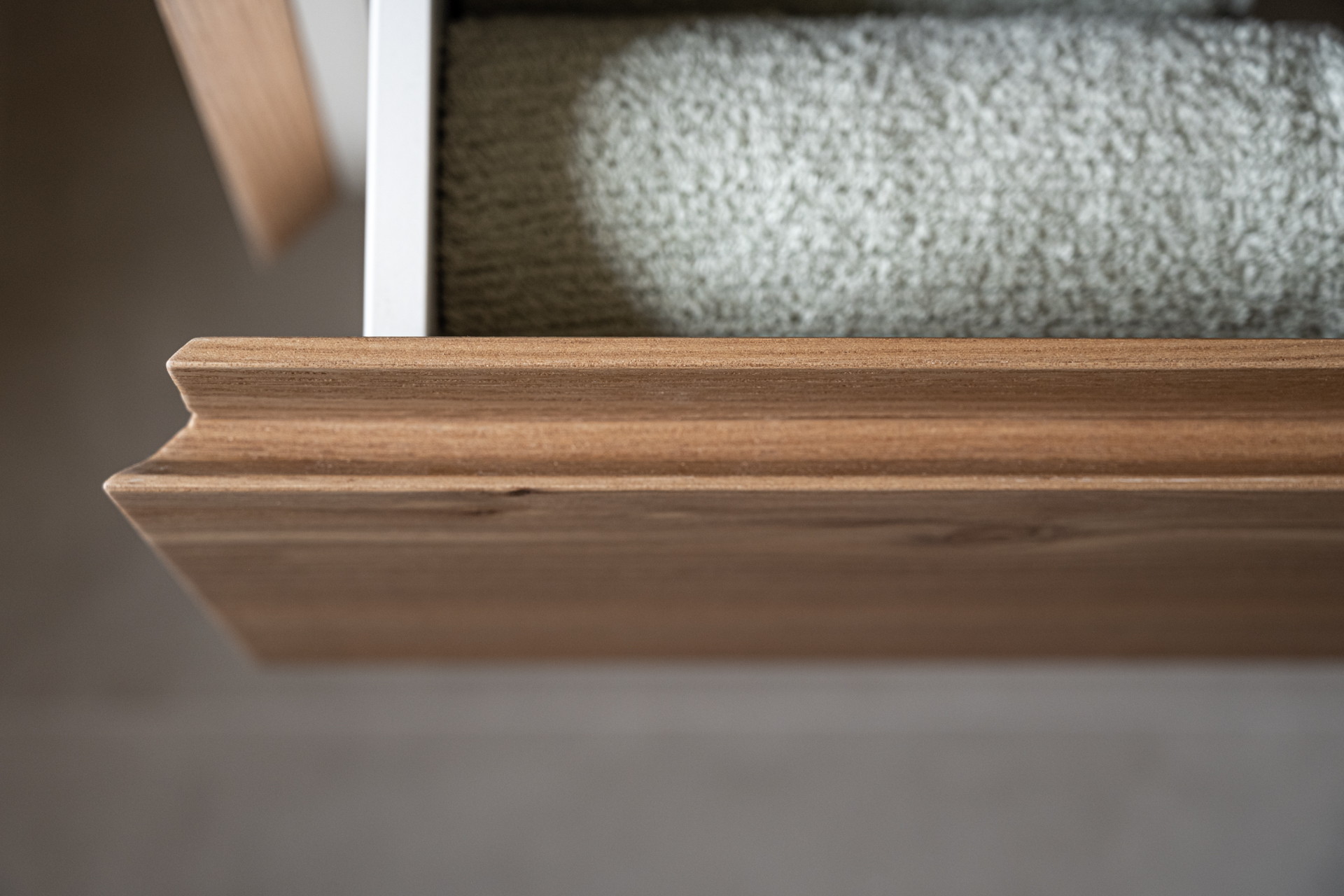 Combinare essenze diverse in un'unica realizzazione è possibile. Il pavimento in essenza di rovere color croissant si combina con gli arredi in olmo naturale spazzolato senza nodi.