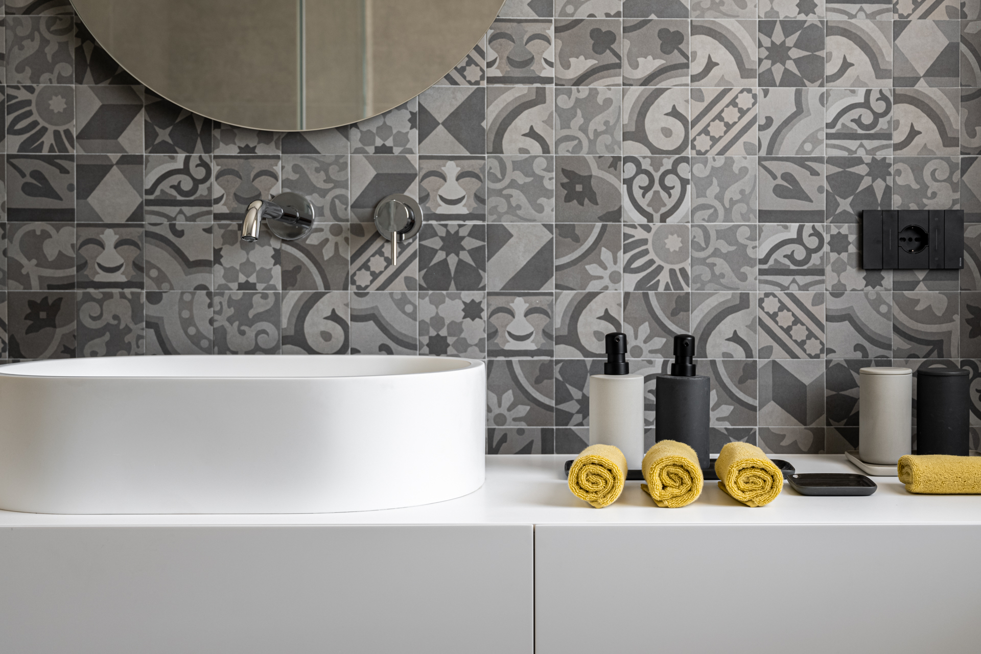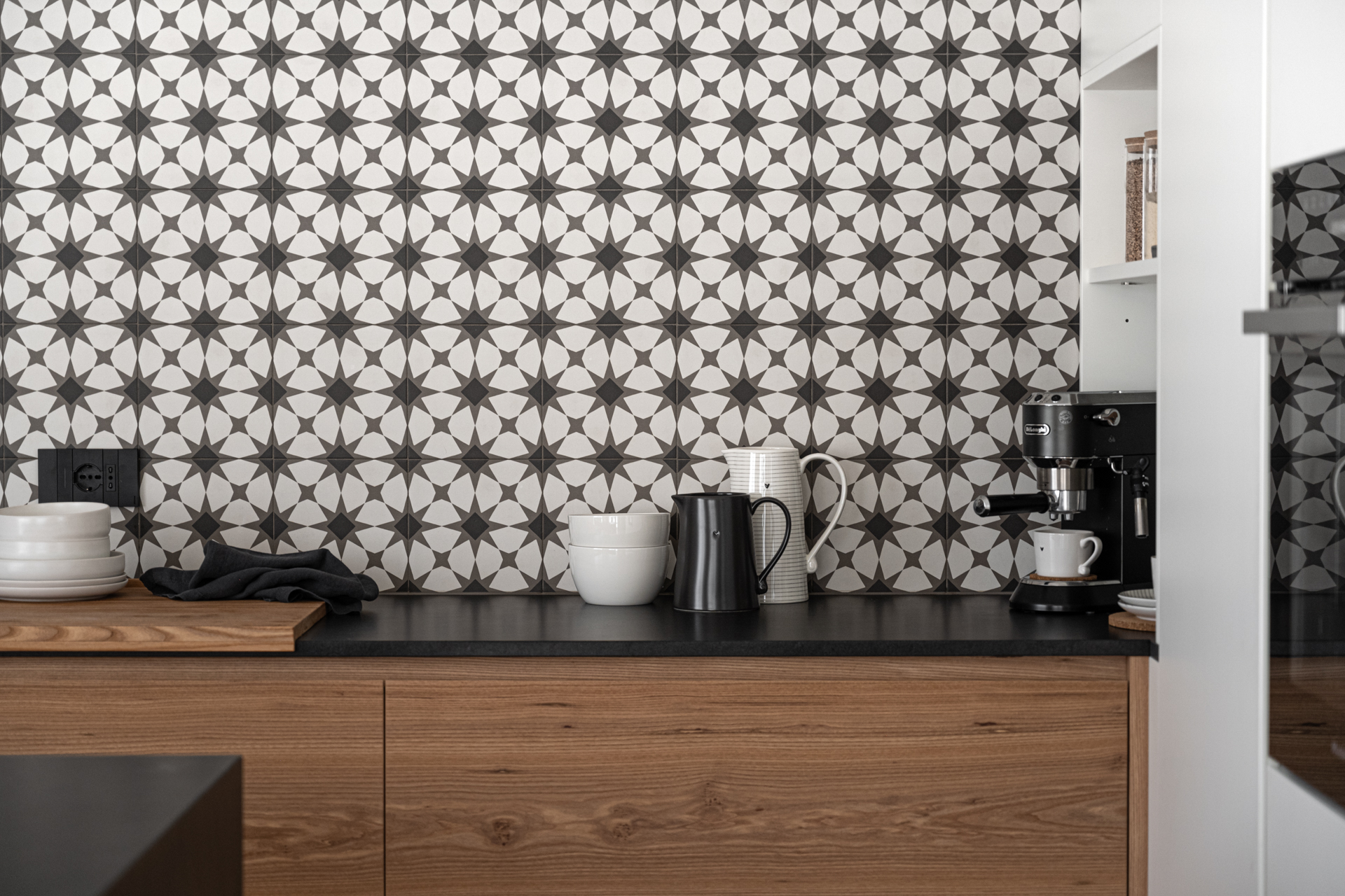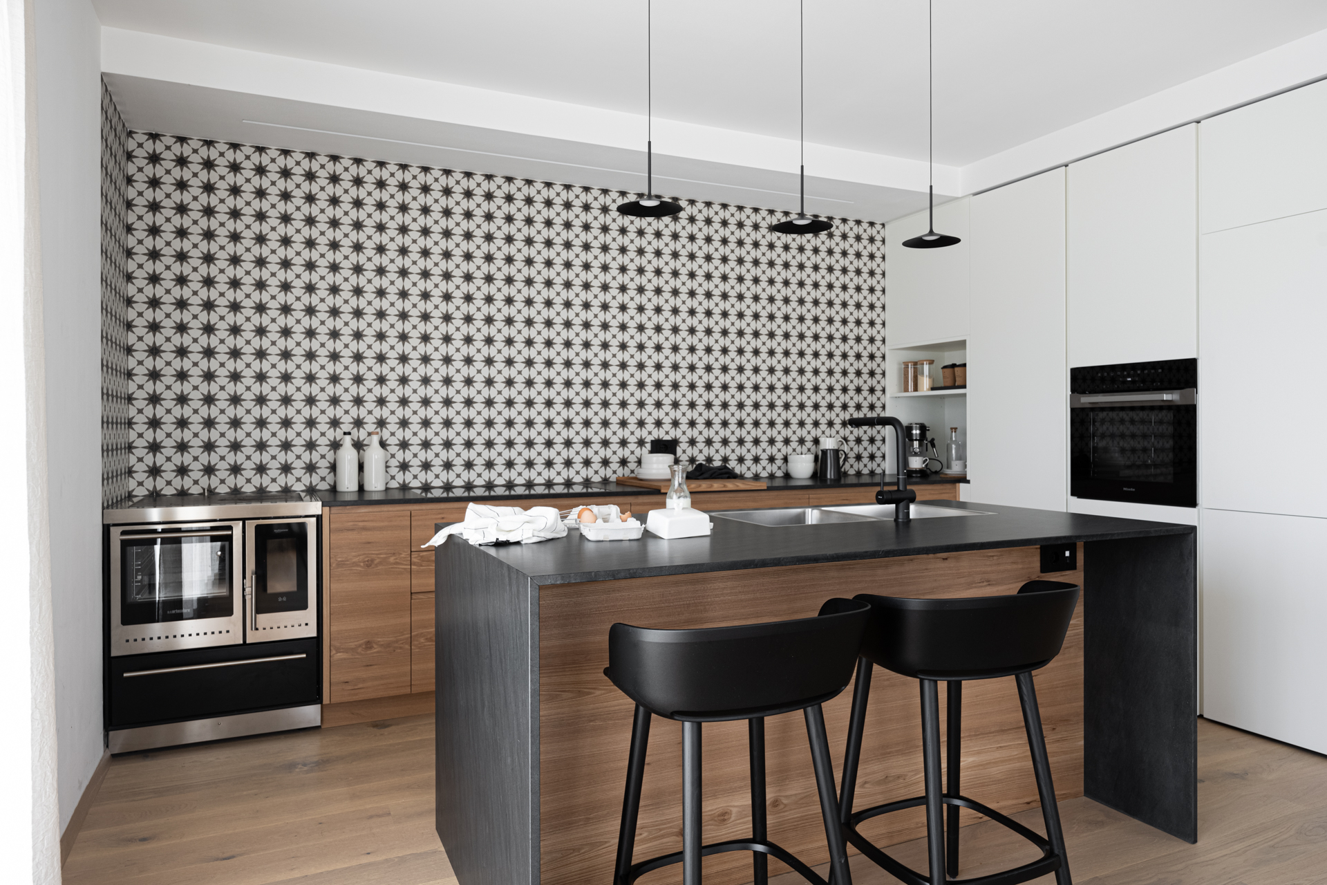 Grande particolarità è data dalla scelta di movimentare gli spazi attraverso la personalizzazione delle pareti dominanti di fondo. Nella cucina e nei bagni si è deciso di utilizzare rivestimenti dal pattern geometrico dalle tonalità del bianco e grigio, mentre nel soggiorno e nella camera matrimoniale si è preferito utilizzare una pittura colorata, per donare all’ambiente maggior leggerezza e giocosità.