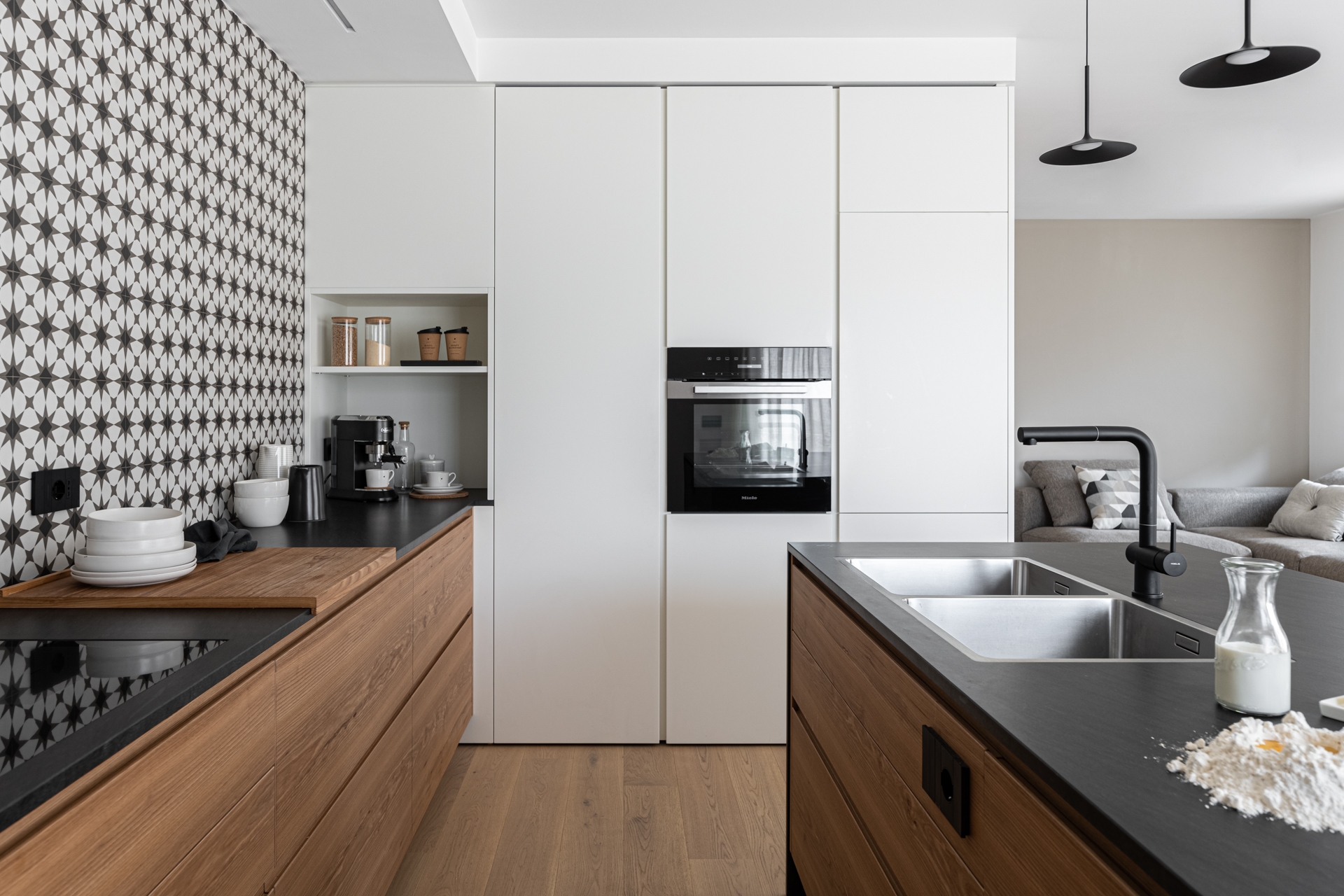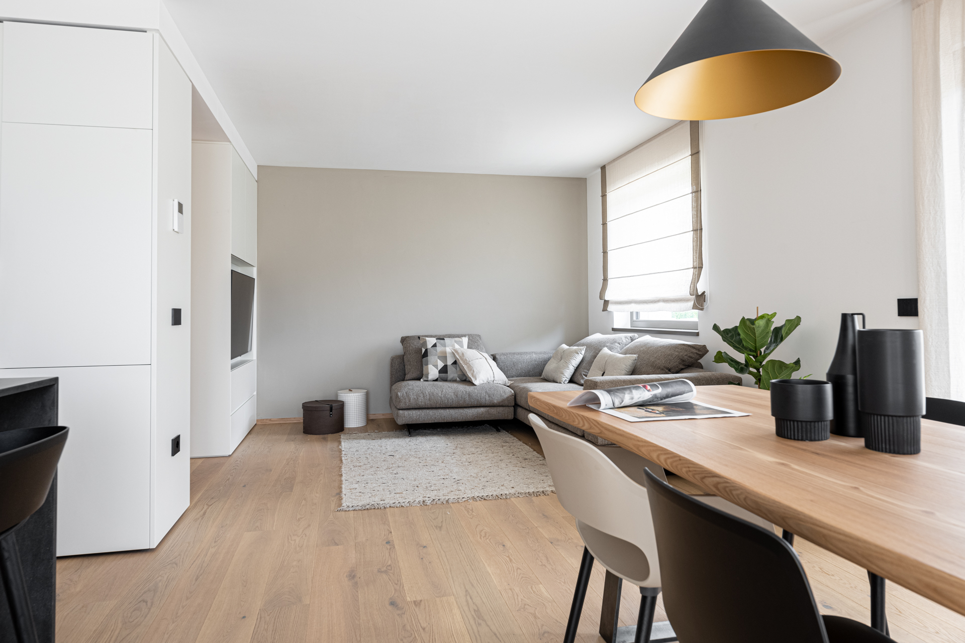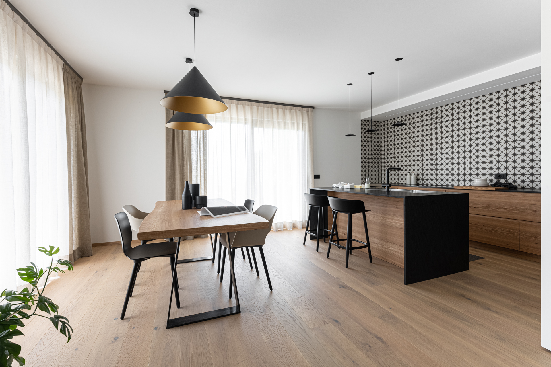 Realizzazione di un appartamento su misura, dal progetto all'arredo, passando per il pavimento in legno. Punto focale della realizzazione è il contrasto tra chiari e scuri, che proiettano in un’atmosfera unica e moderna.