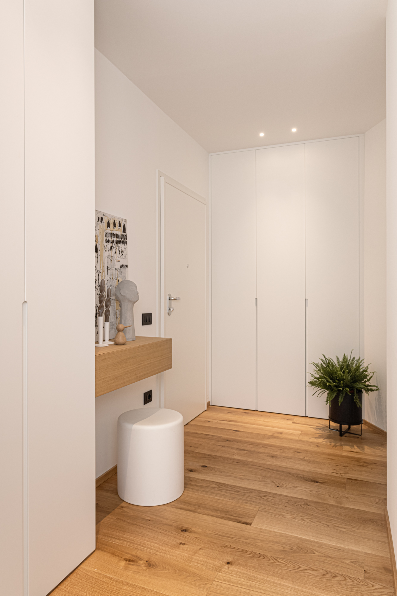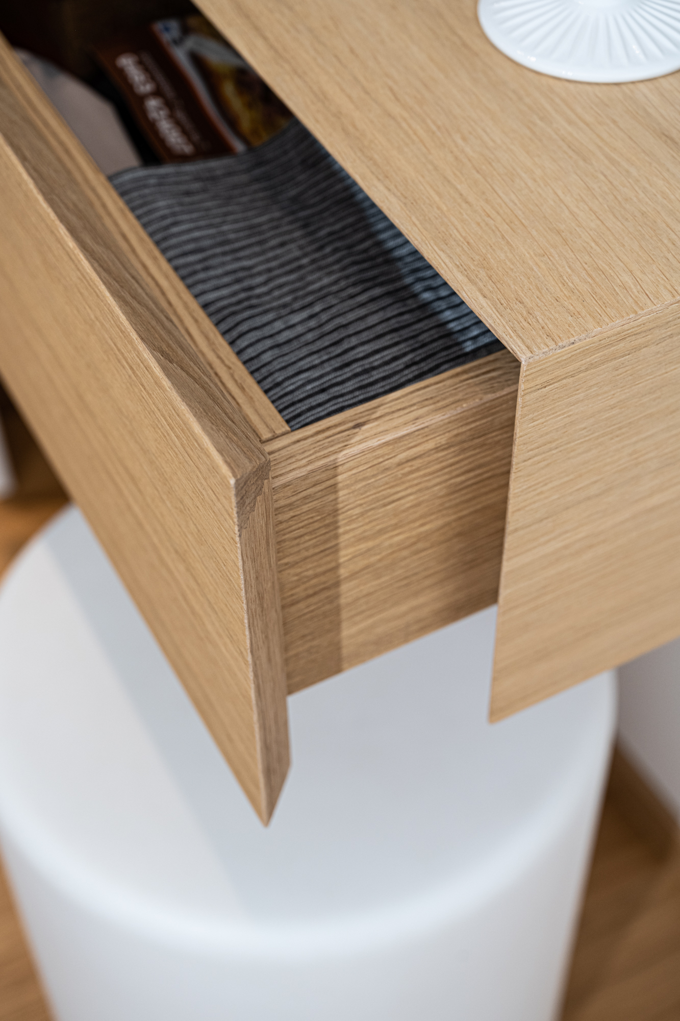 Il rovere senza nodi esalta la purezza delle forme, rendendo la parete di fondo una quinta perfetta per i momenti più allegri.