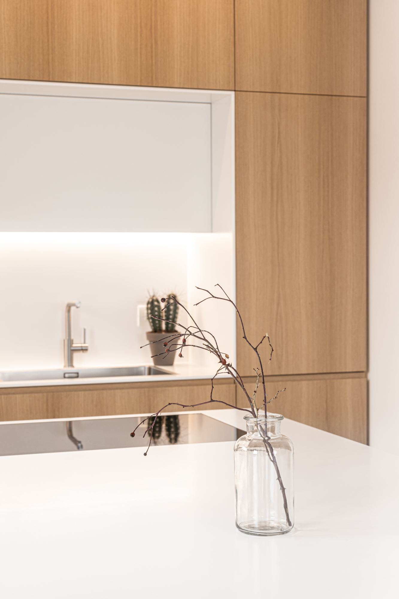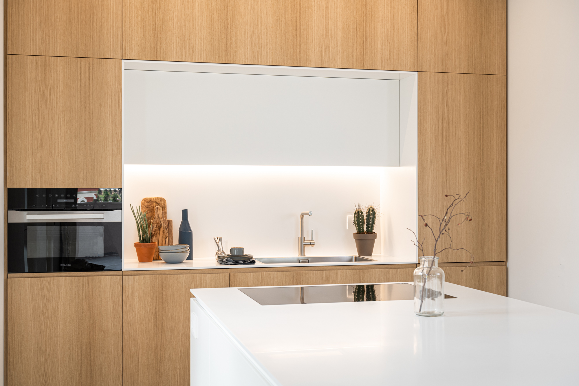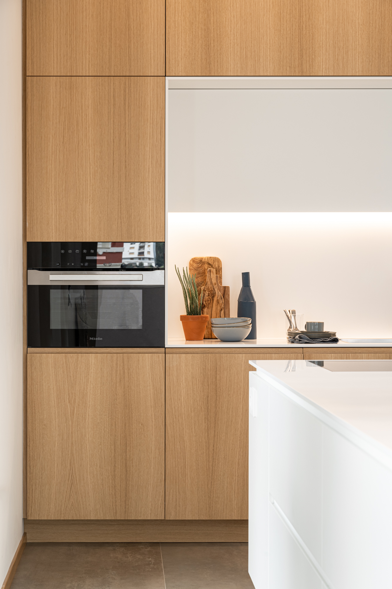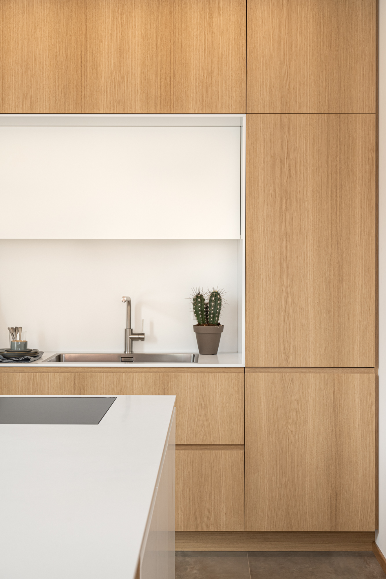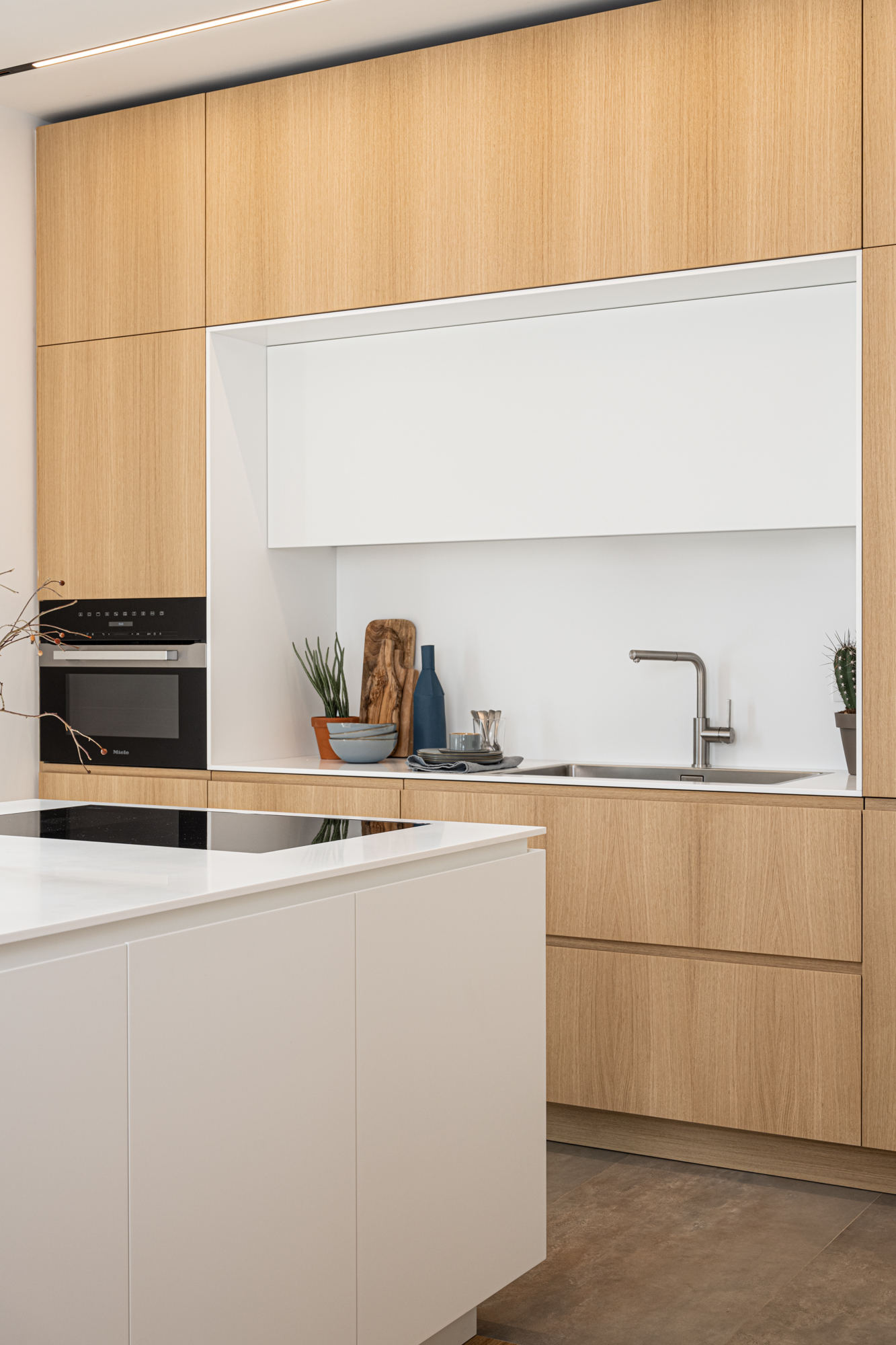 CucinATTI si sviluppa in pianta con una forma a T. La parete di fondo ospita una zona di lavoro con lavello integrato in nicchia, riservata e discreta. Lo spazio operativo e conviviale invece coesistono sulla grande isola che si allunga verso la zona living e mette in comunicazione le due zone, quasi fosse un'estensione della stessa.