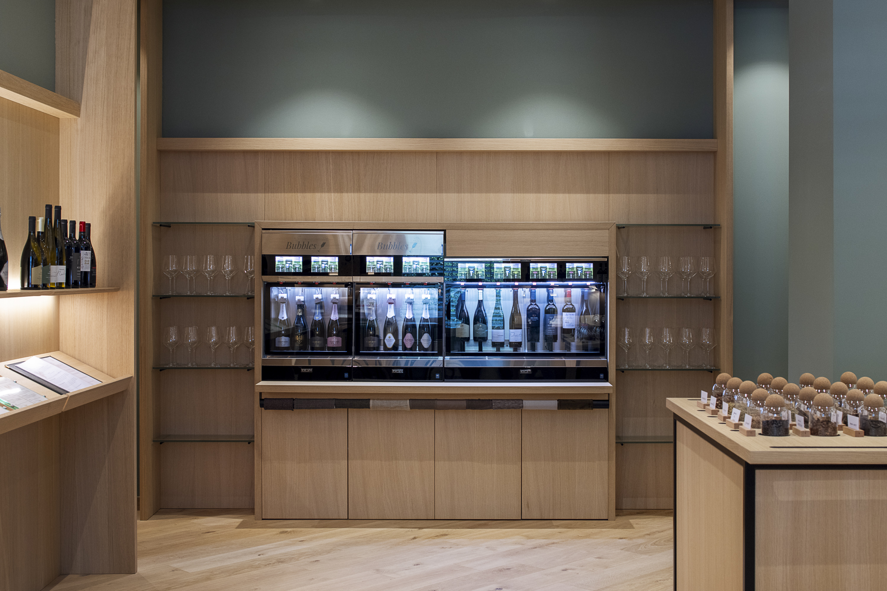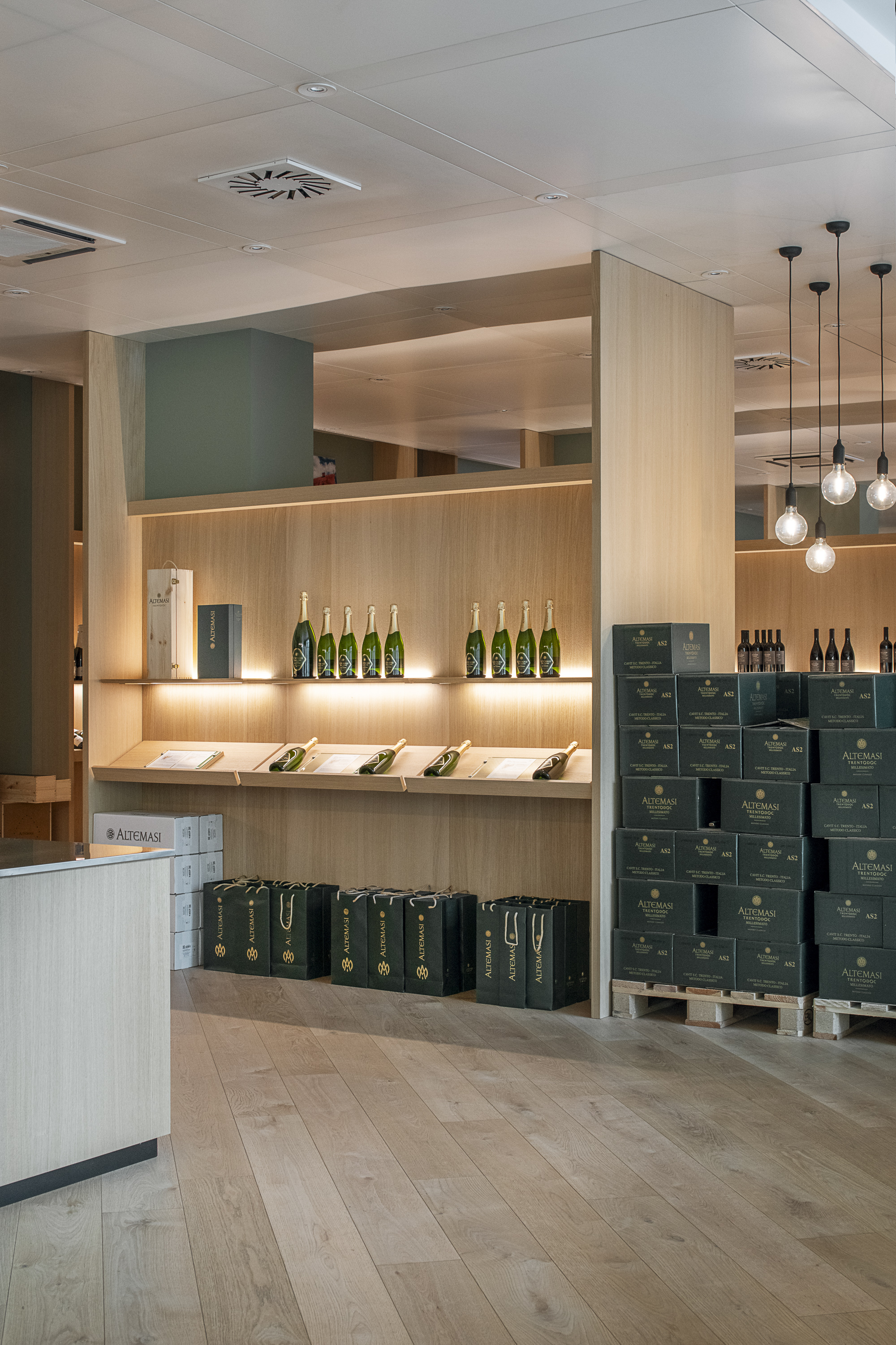 Per il banco degustazione, Corazzolla ha reinterpretato l’idea dell’architetto: dagli elementi essenziali della produzione dello spumante e dal gesto del remuage è nato un oggetto di design iconico, simbolo del progetto.