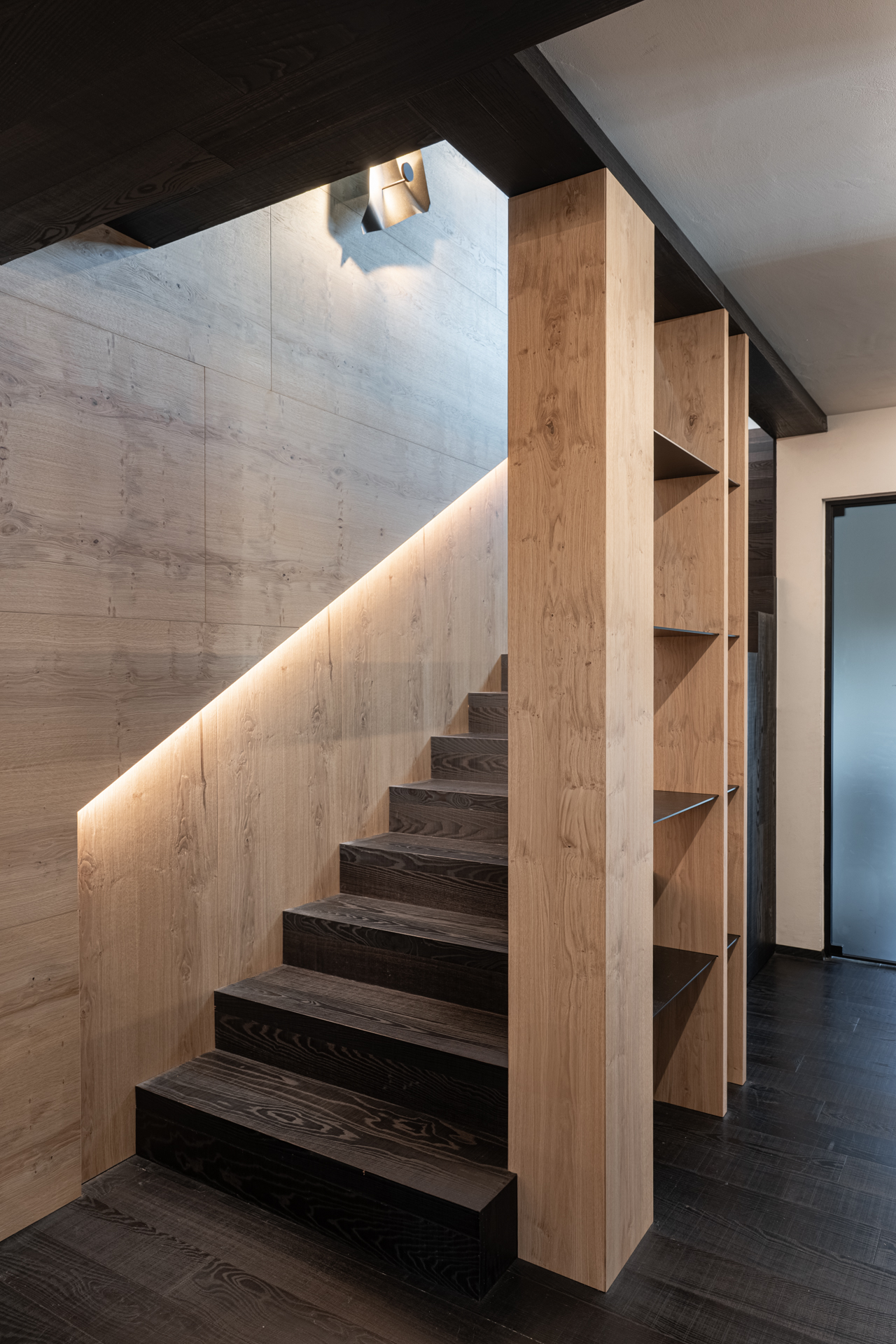 Qui il contrasto materico diventa protagonista: il legno di frassino termocotto scuro dei gradini dialoga con il rivestimento in rovere naturale, generando una sovrapposizione calibrata di texture e tonalità.
