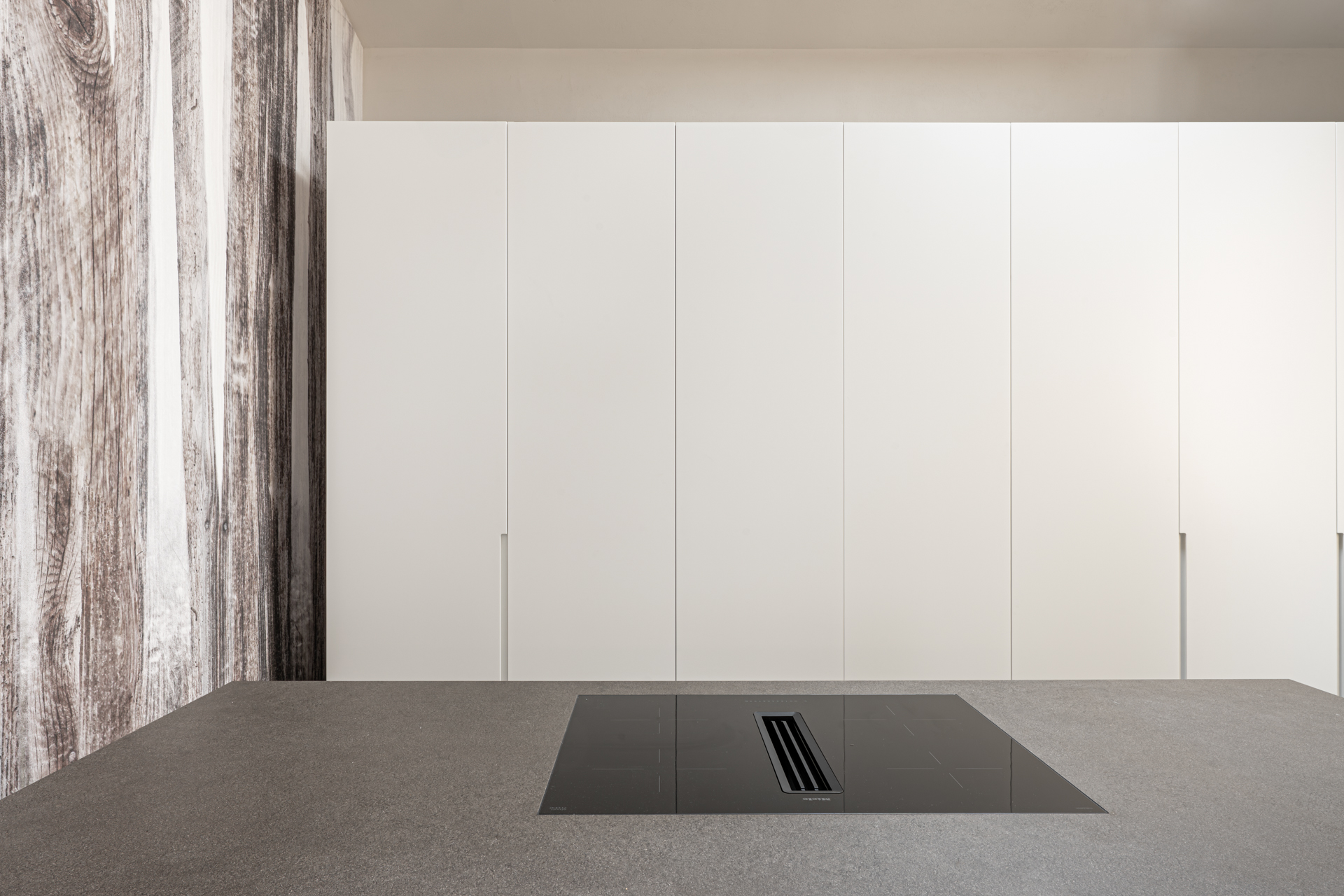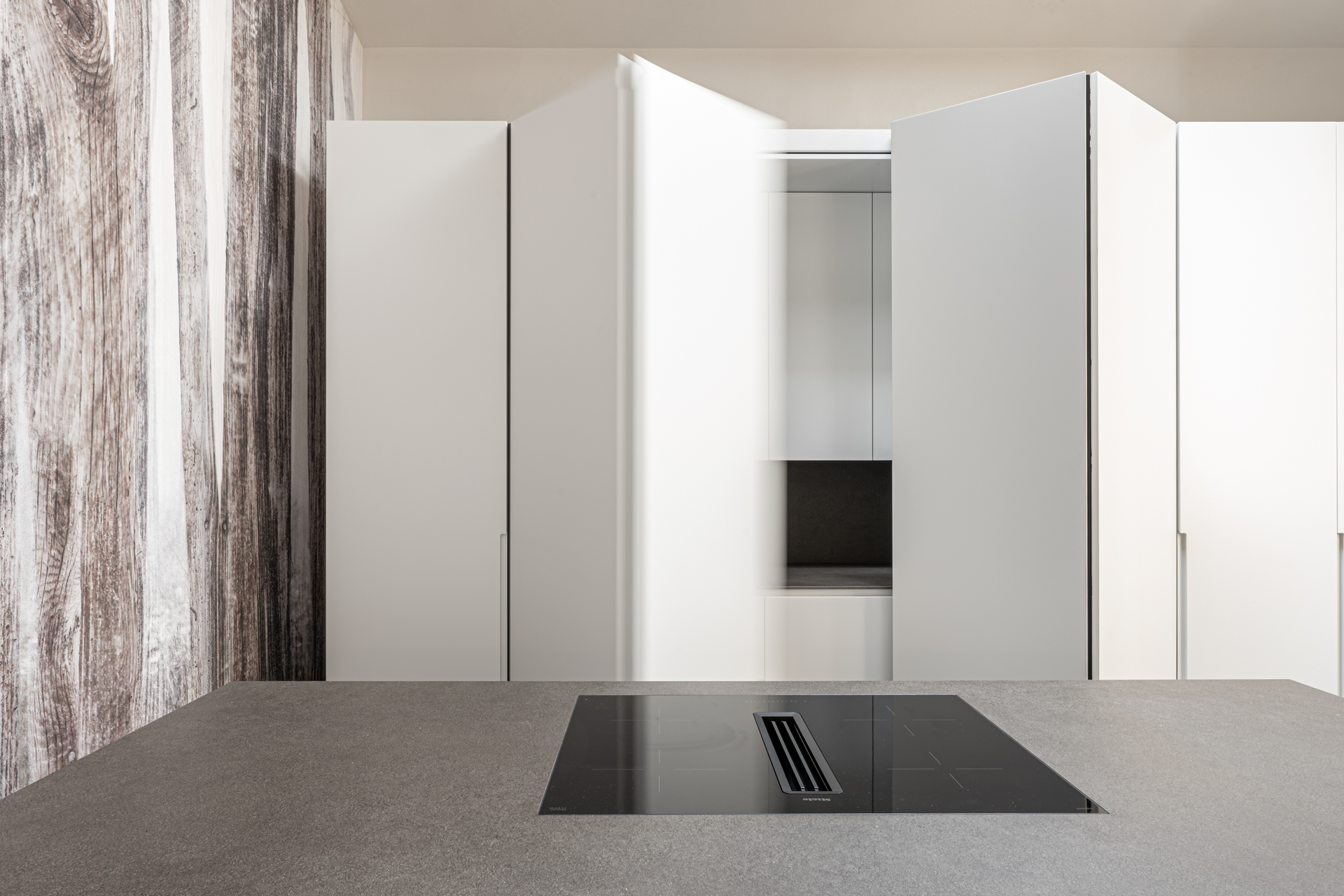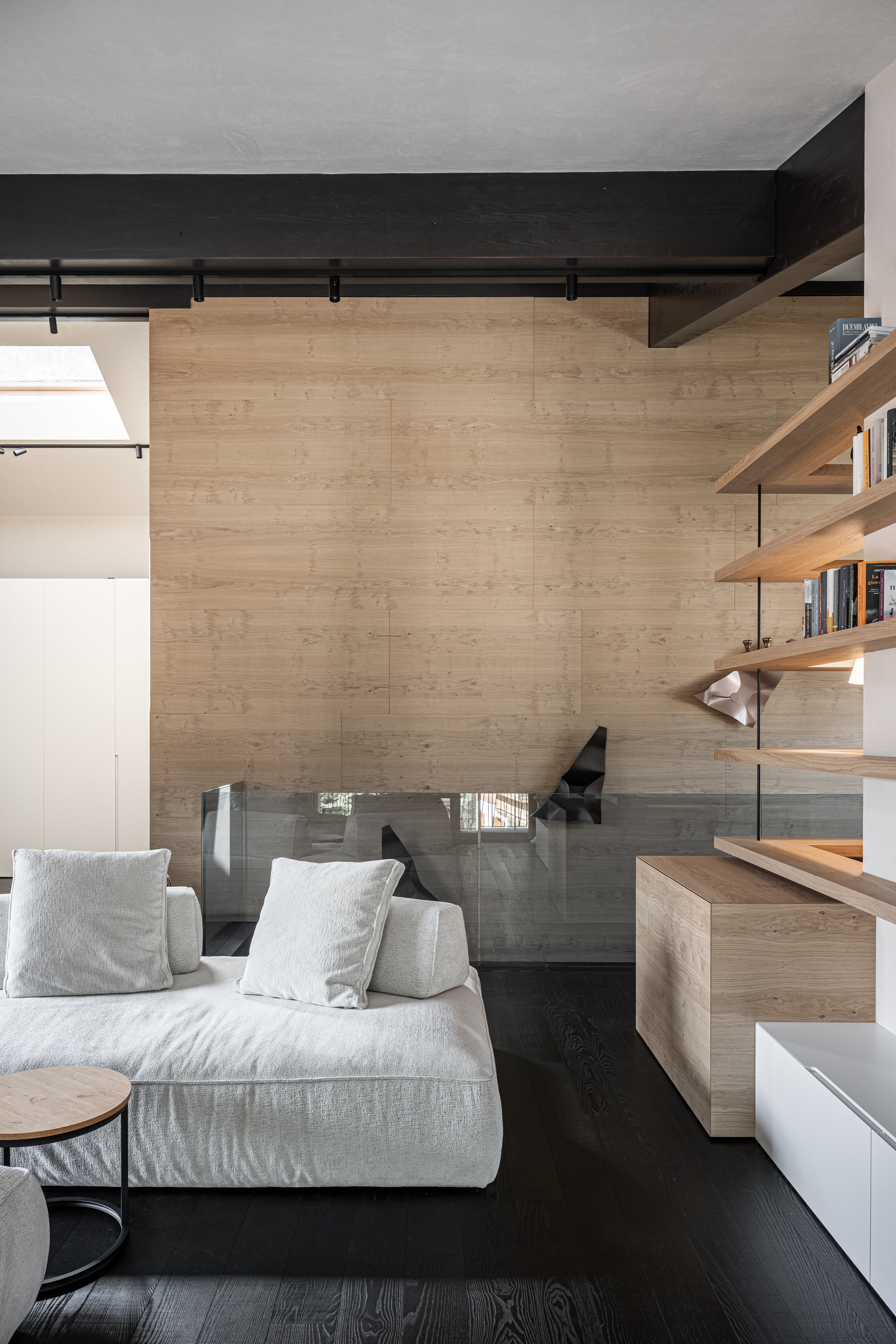 Il racconto della casa inizia dal suolo, dove il pavimento in frassino scuro termocotto definisce un segno deciso e contemporaneo. La sua texture profonda e la tonalità quasi nera diventano la base su cui si costruisce il ritmo dello spazio, generando un contrasto deciso con le superfici chiare in laccato bianco e con i rivestimenti in rovere naturale impiallacciato.