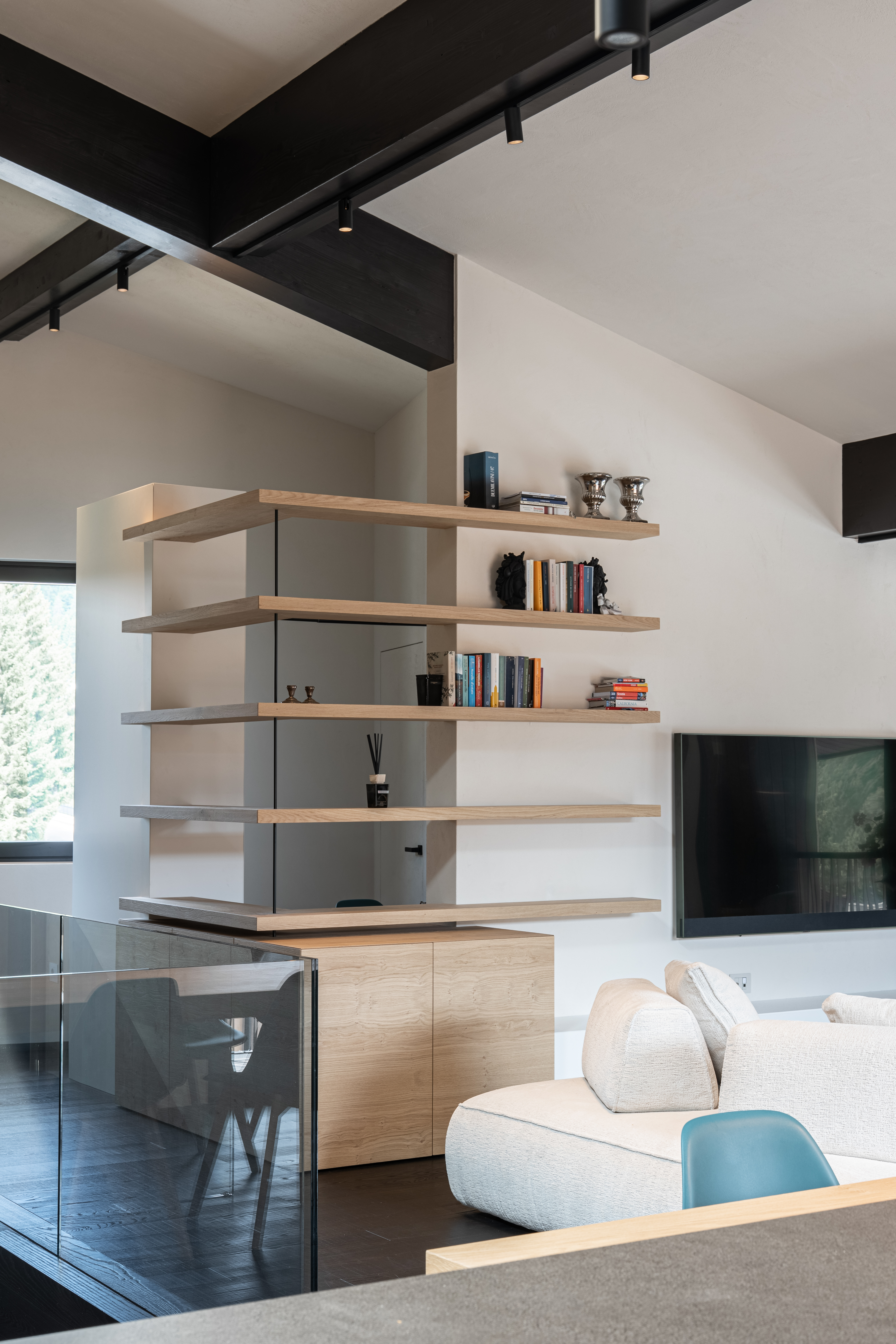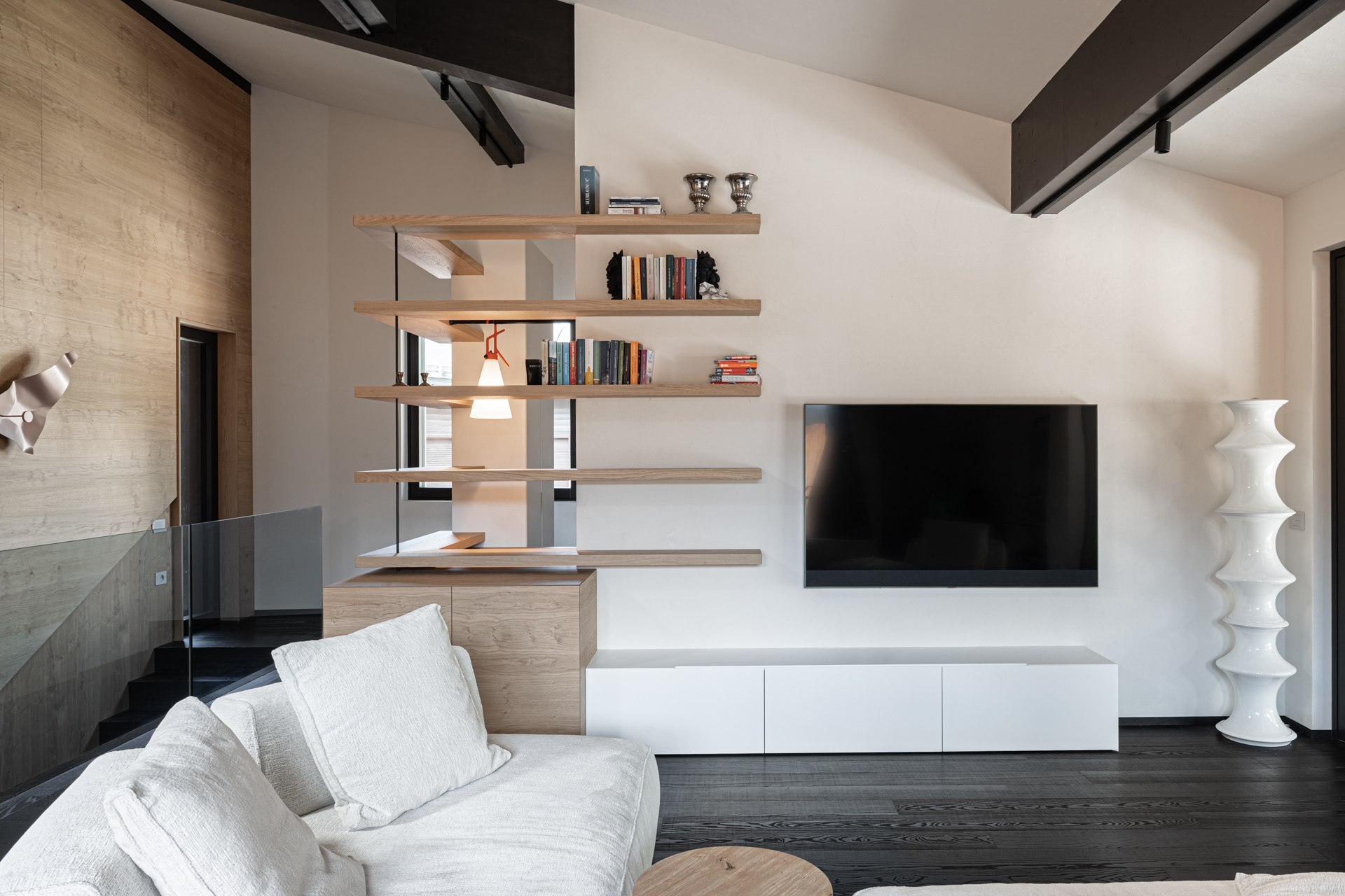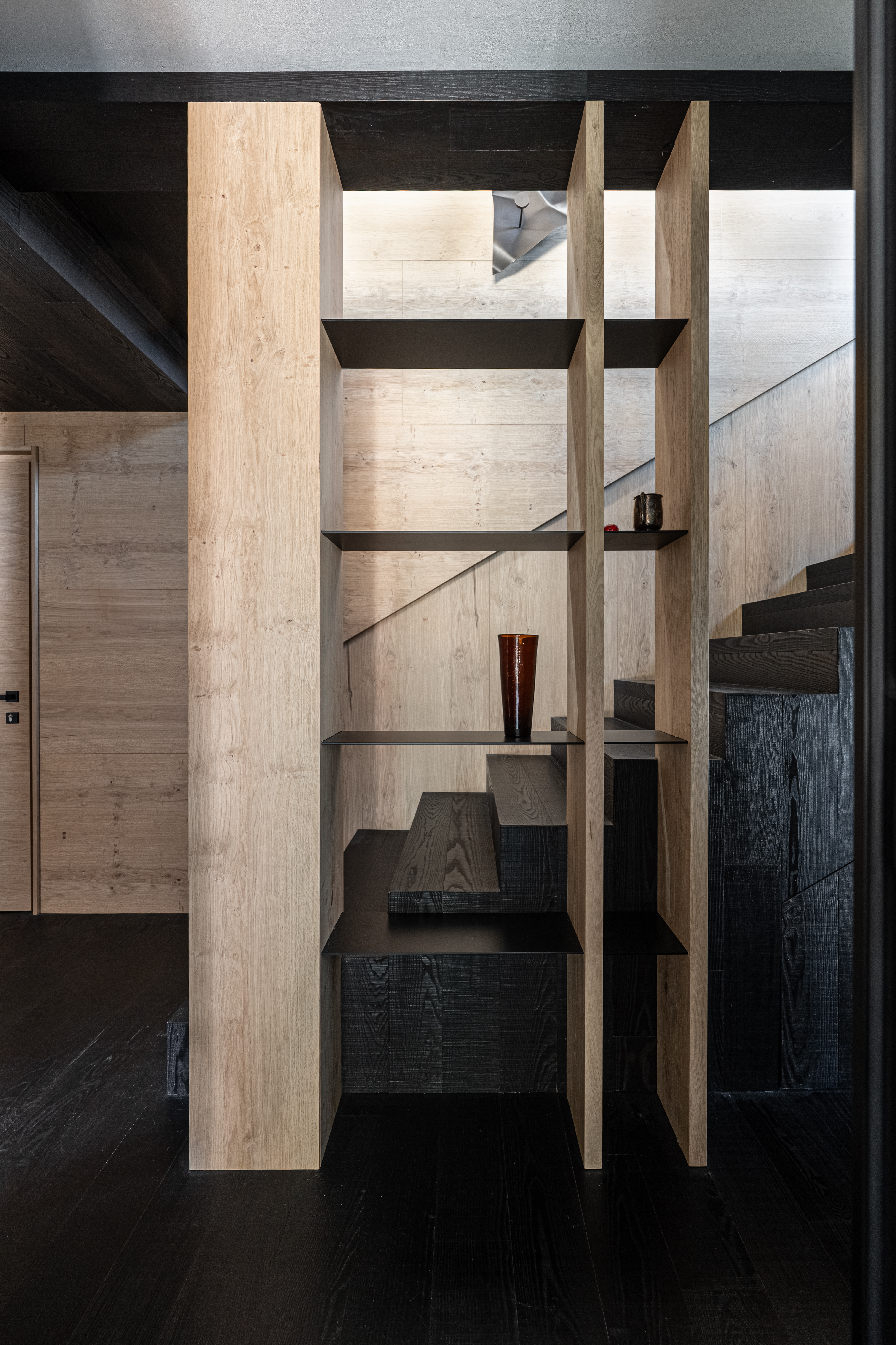 La struttura non è soltanto un elemento di passaggio, ma una composizione tridimensionale che alterna pieni e vuoti, trasformandosi in un sistema contenitivo integrato — un luogo per oggetti, libri e luce.