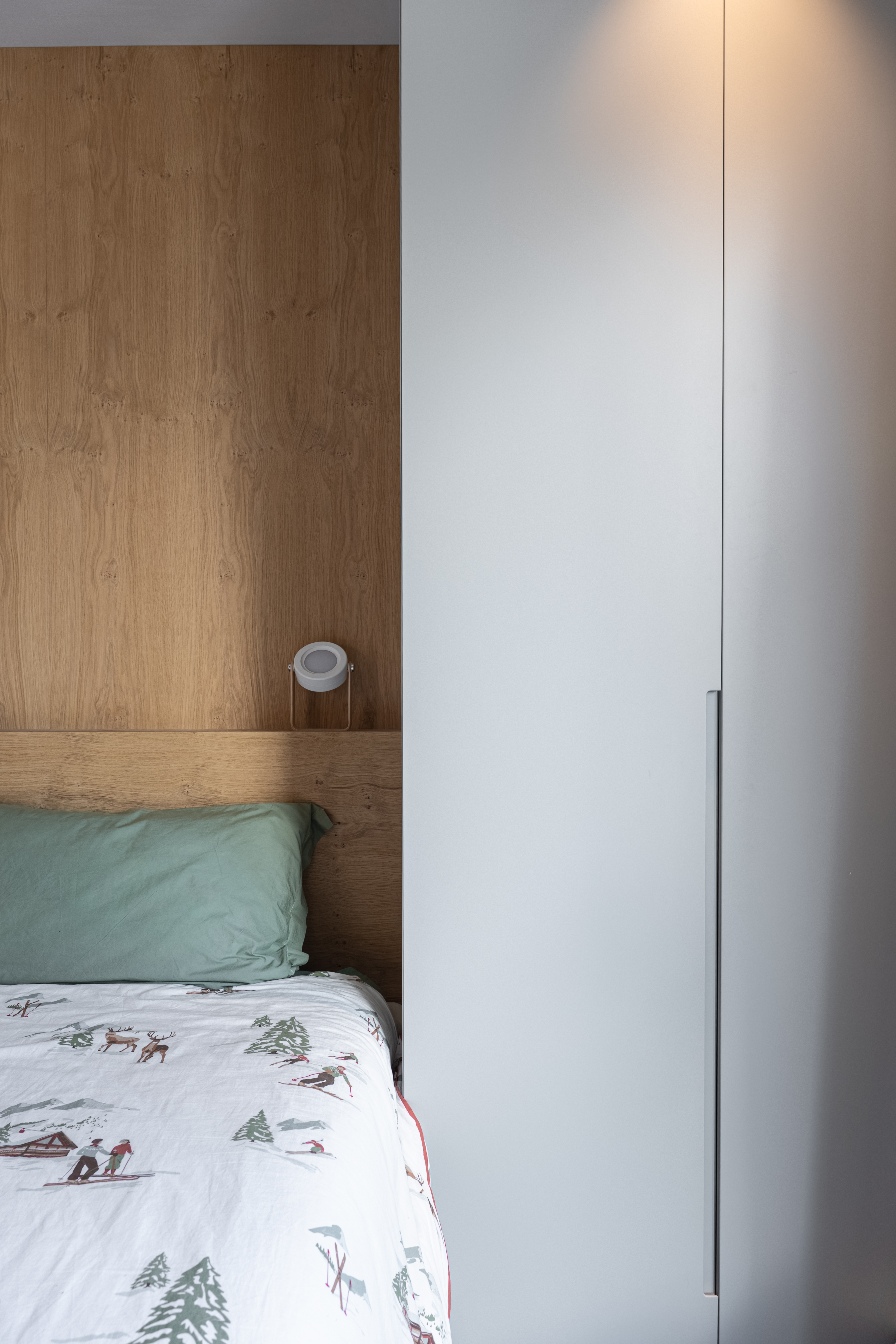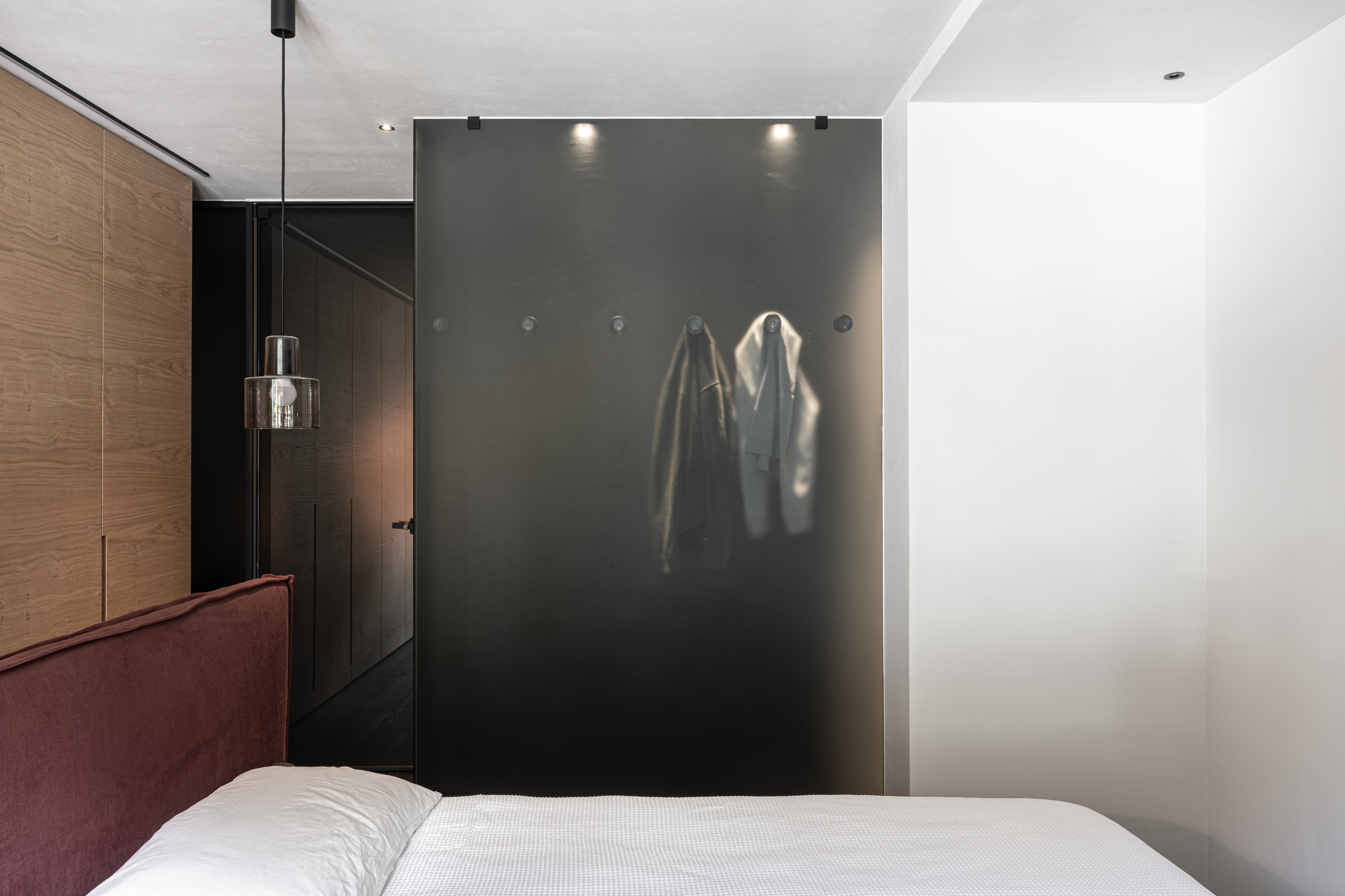 Il letto, posto al centro della stanza, diventa protagonista dello spazio e definisce un nuovo modo di abitare la zona notte: non più addossato alla parete, ma libero, accessibile da entrambi i lati, in perfetta simmetria con l’architettura circostante. Alle sue spalle si apre un passaggio discreto che diventa cabina armadio, un filtro funzionale e visivo che amplifica la profondità dello spazio. Il movimento intorno al letto è fluido e naturale, come in un percorso continuo tra intimità e apertura. L’ingresso alla stanza è mediato da un pannello in vetro fumé, con un effetto vedo-non-vedo che svela e protegge al tempo stesso. Questo materiale, utilizzato come soglia visiva, restituisce un senso di privacy contemporanea, dove la luce filtra con morbidezza, creando riflessi e ombre mutevoli nel corso della giornata.