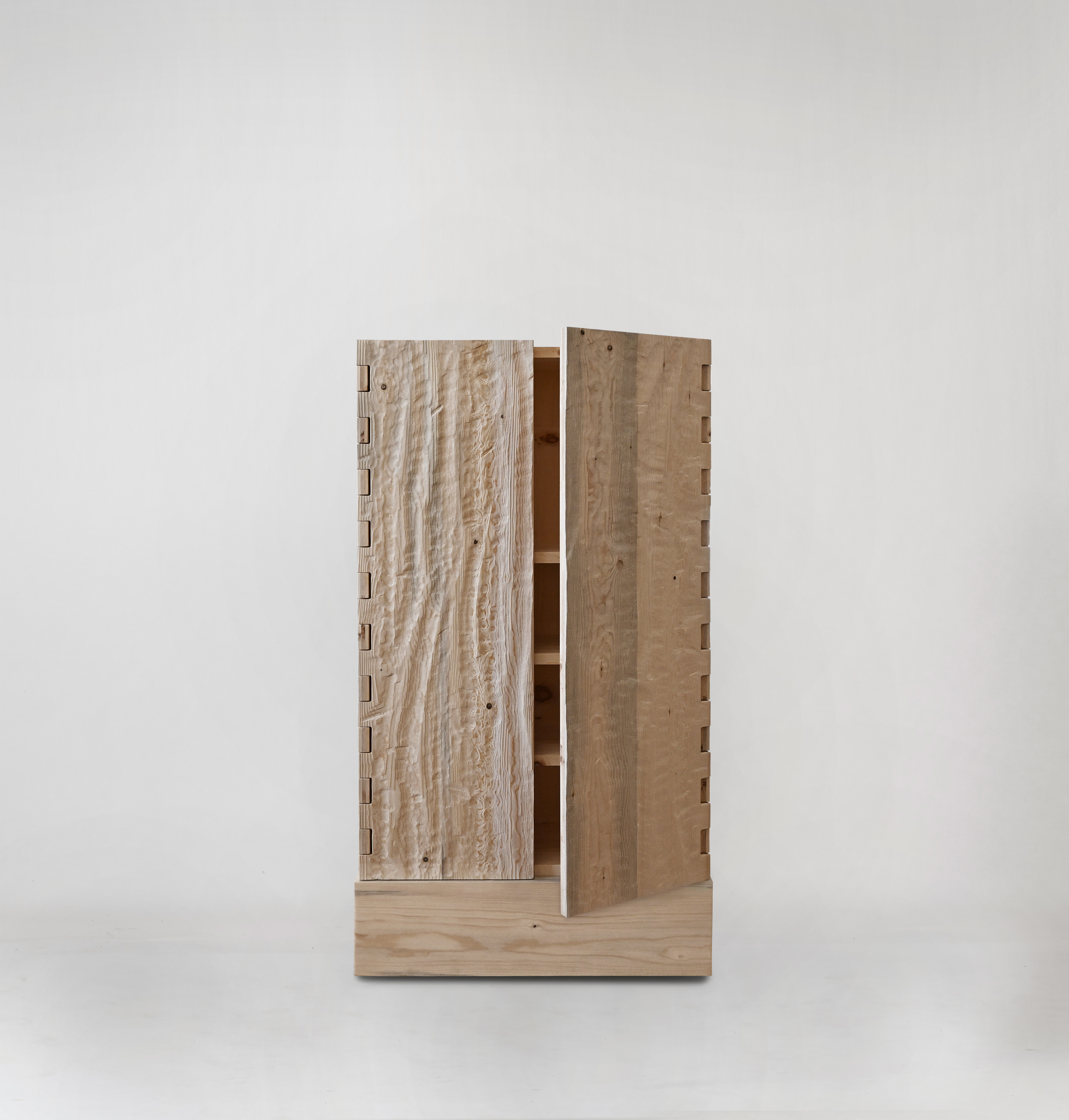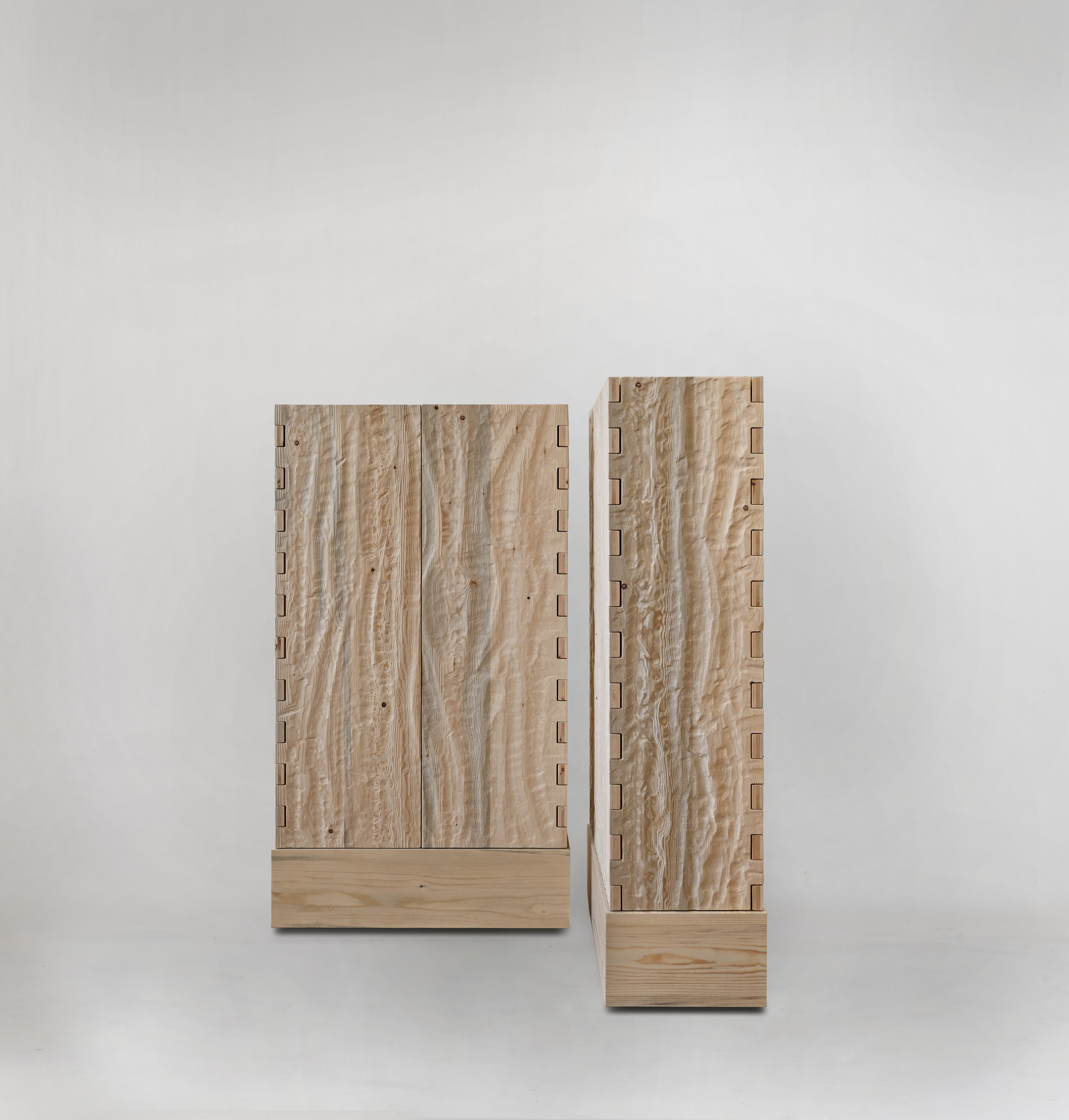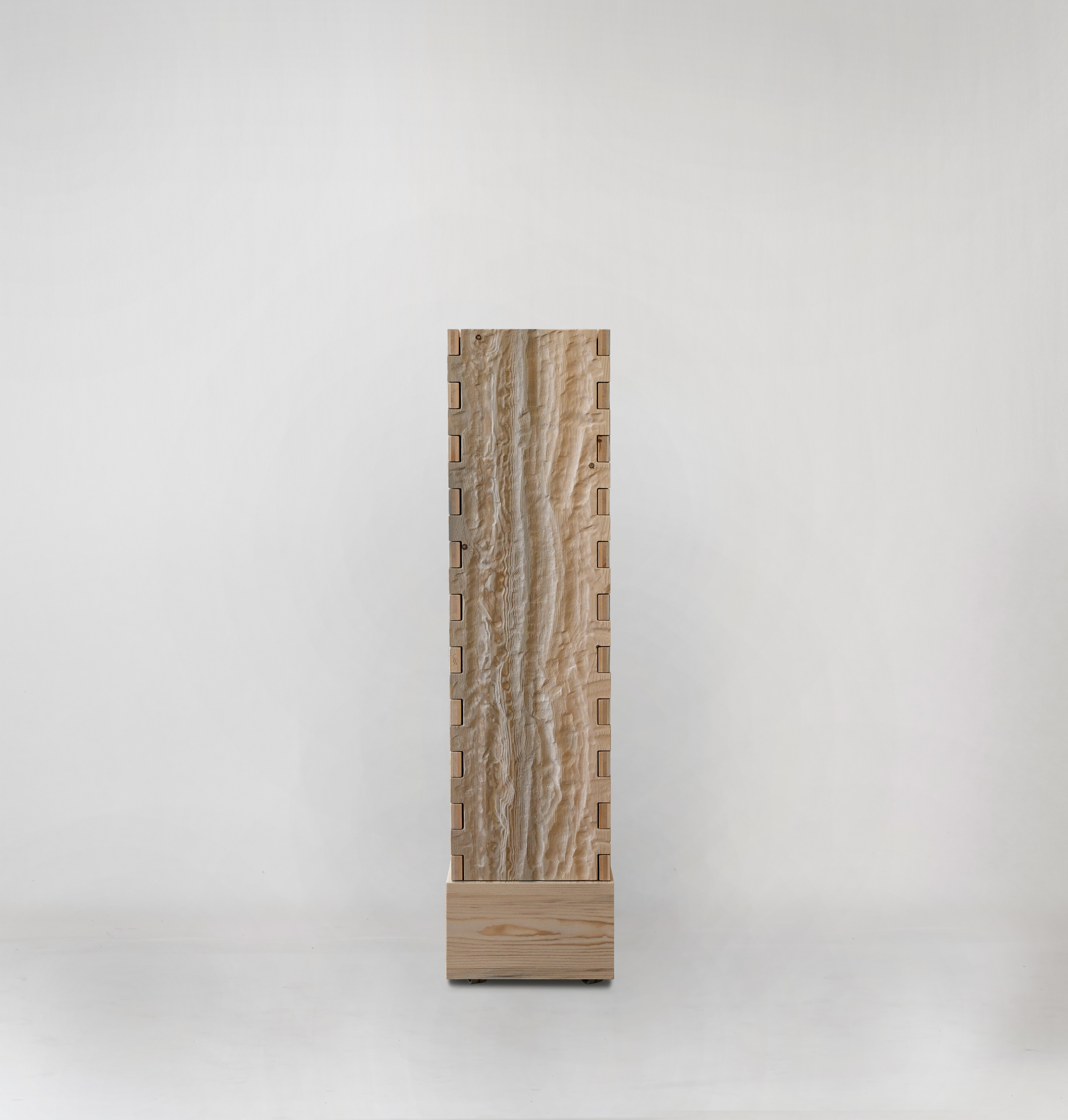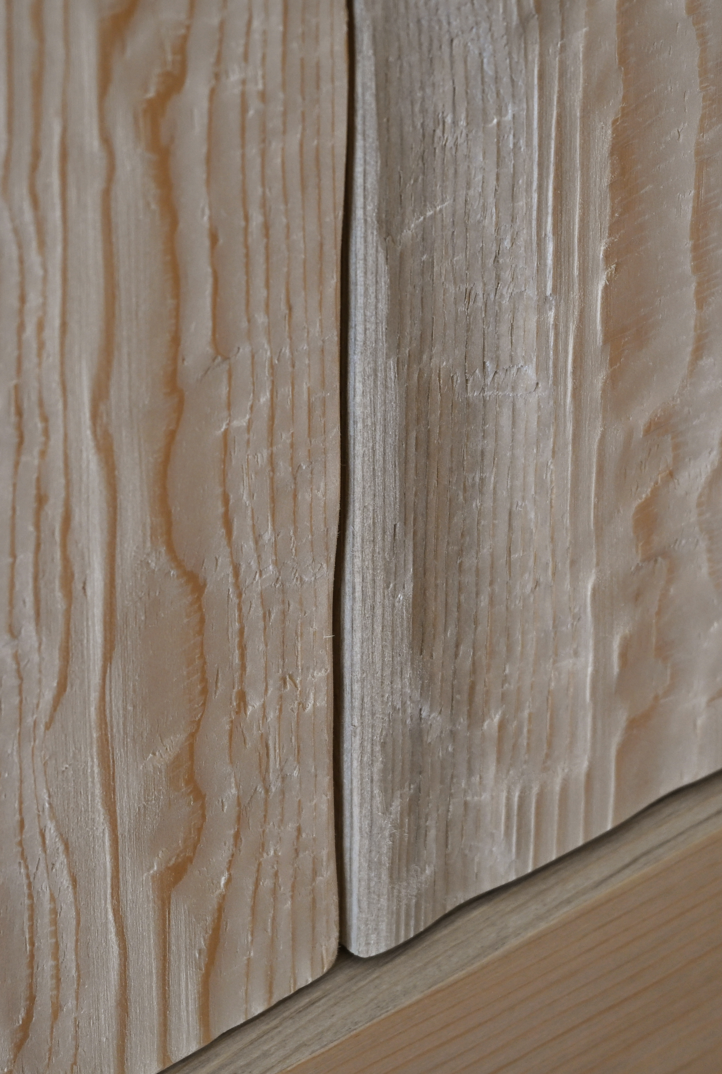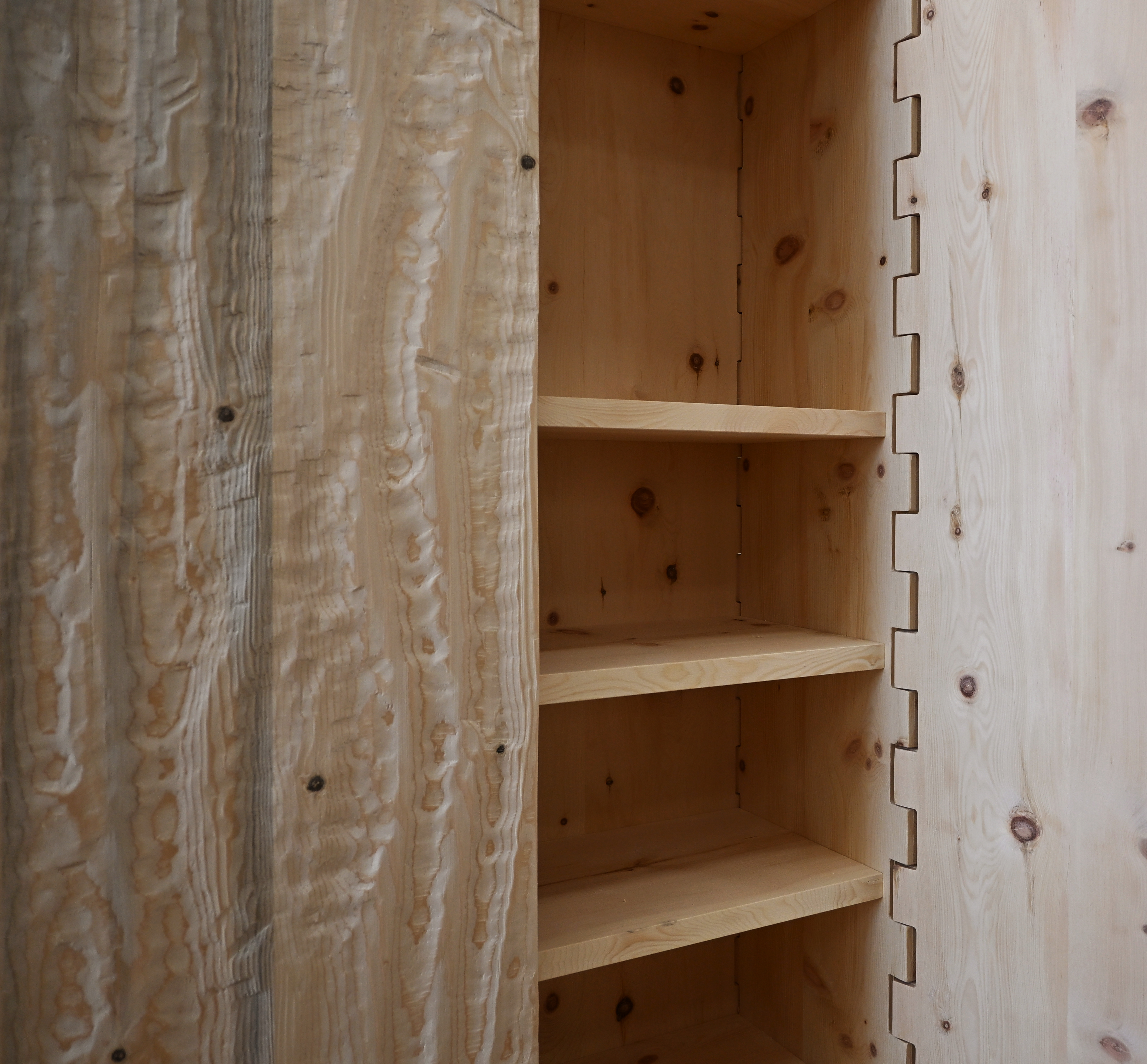 La Natura si manifesta nella sua forma primordiale, ispirata alla roccia dolomitica. Il volume superiore, scolpito in abete blu di Fiemme, è lavorato manualmente a scudisciate, evocando le superfici erose delle montagne. La base ampia e solida sostiene l’intera struttura, trasformandola in una presenza scultorea e totemica.