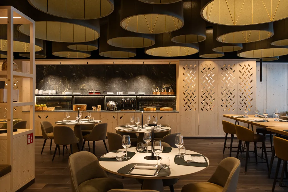 Interior design sartoriale per il Ristorante Lares a Madonna di Campiglio: un progetto firmato Fragmentastudio e realizzato da Corazzolla che trasforma la natura trentina in un’esperienza sensoriale tra legno, luce e materia.
