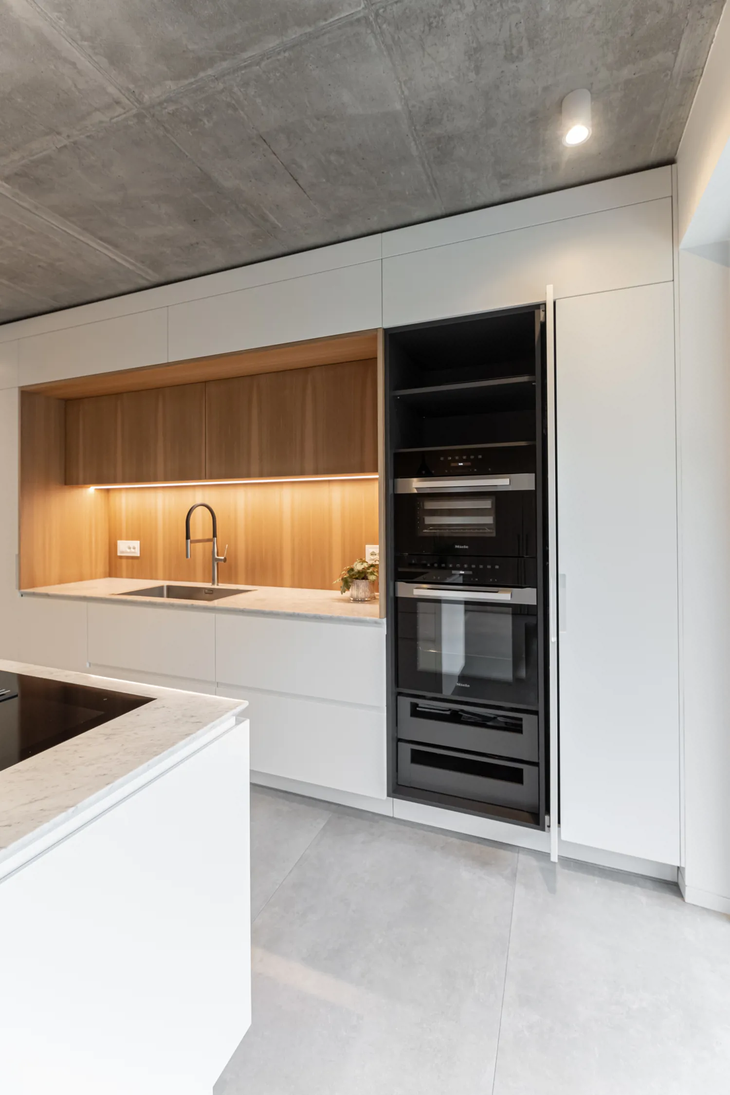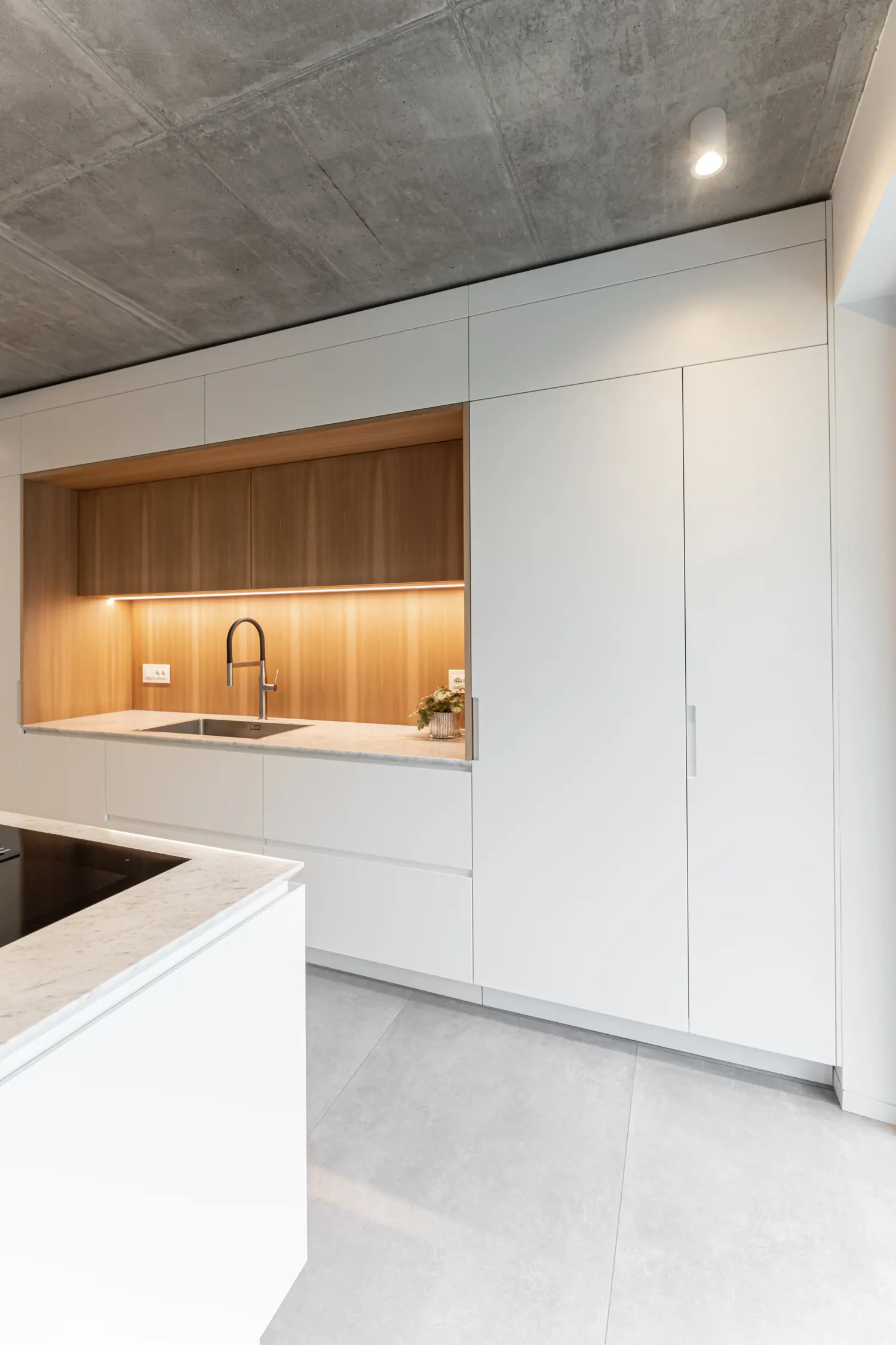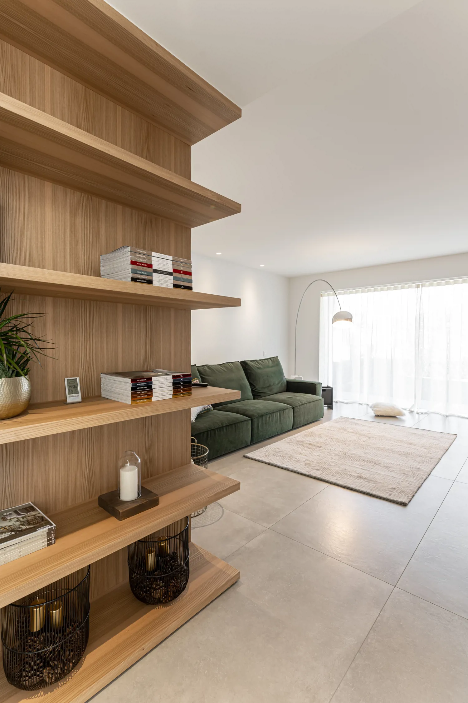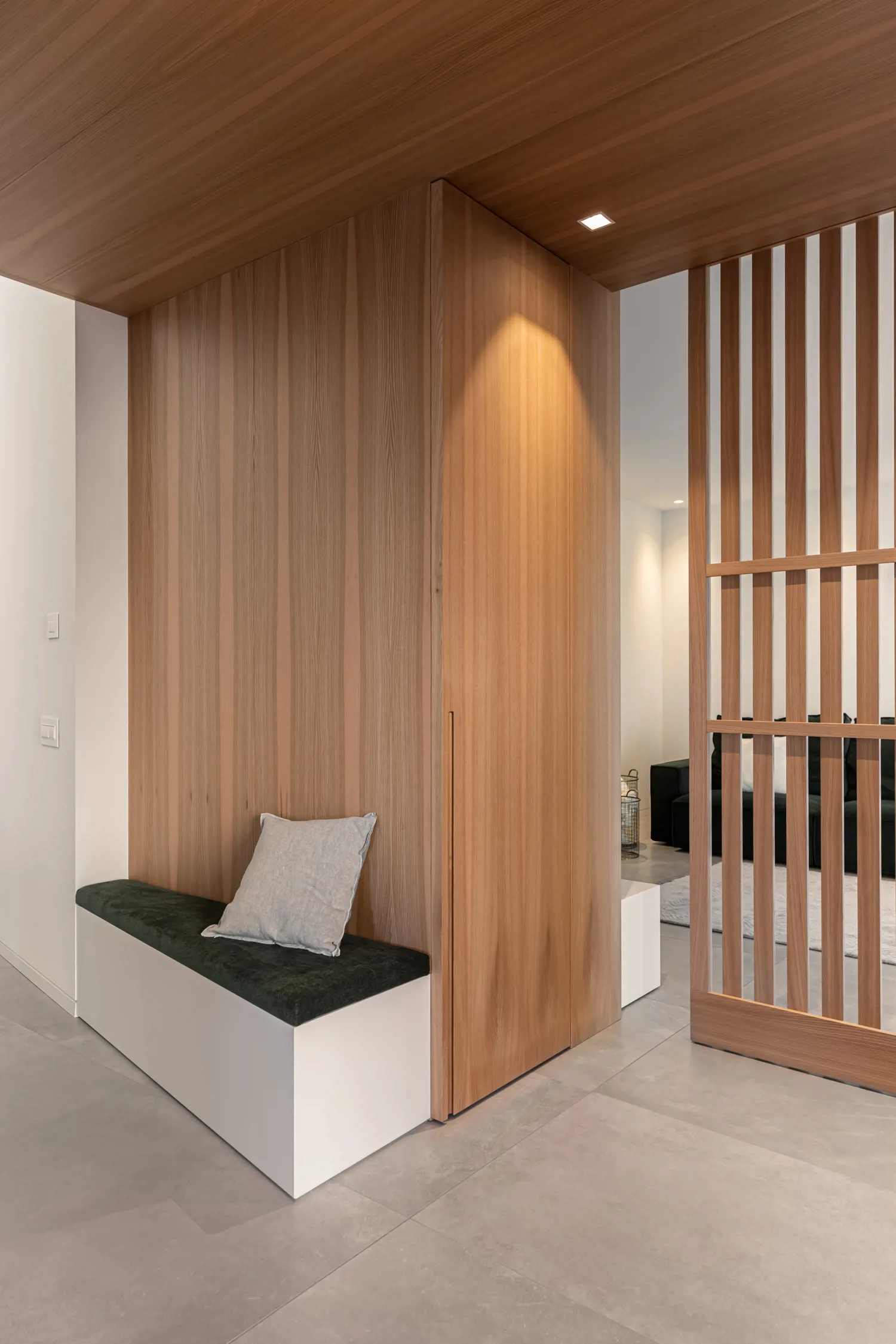 Un arredo su misura che gioca con gli spazi, opere di falegnameria che concorrono nella definizione degli ambienti in un incontro tra calda accoglienza del legno e fresca essenzialità dei toni contemporanei e delle linee minimal.